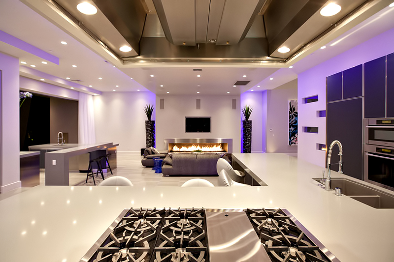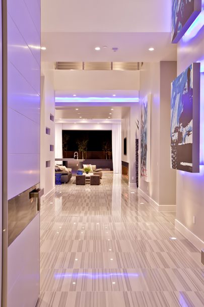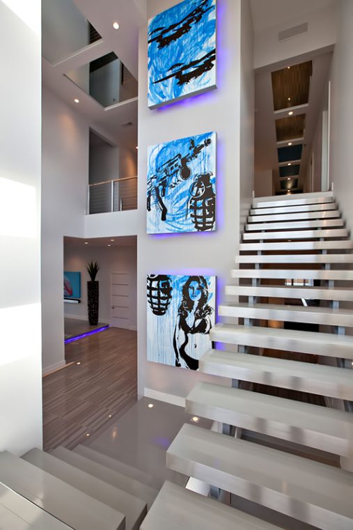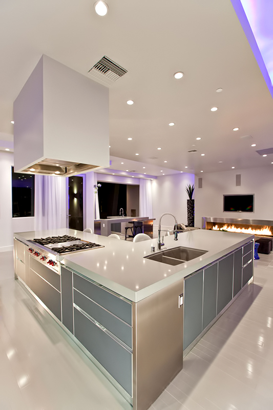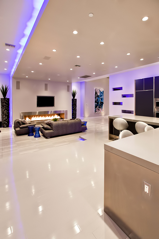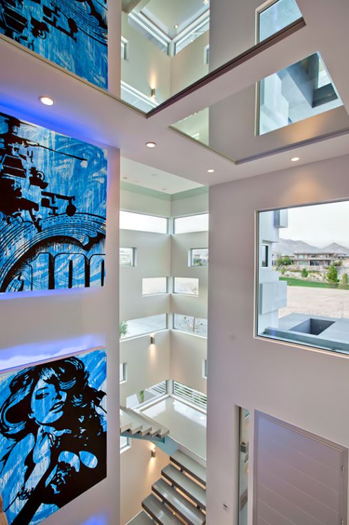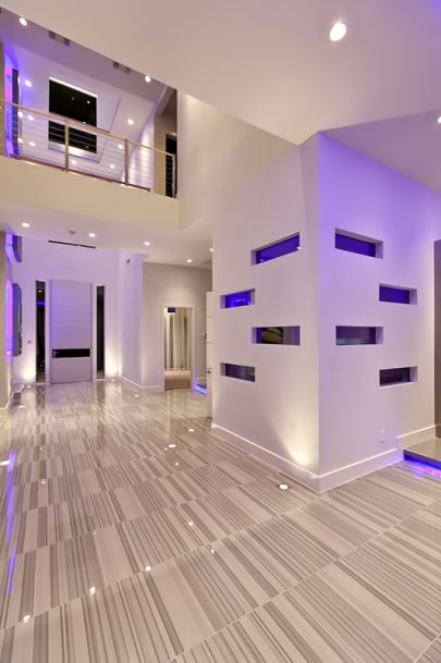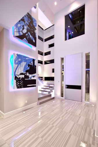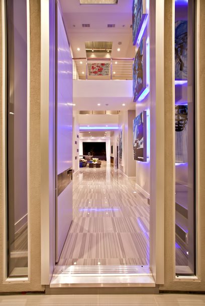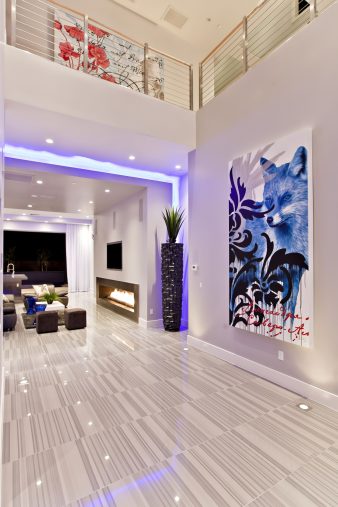 Resonating with style and panache, this unforgettable Las Vegas residence features an 11-foot custom-designed aluminum front door that opens to striped Italian floor tile, a three-story elevator tower surrounded with custom art, a floating staircase trimmed with stainless steel accompanied by Scavolini cabinets and a 14-foot wide fireplace in the kitchen along with a startlingly extensive use of glowing blue LED lighting accents throughout the home that is sure to catch your attention.