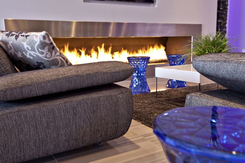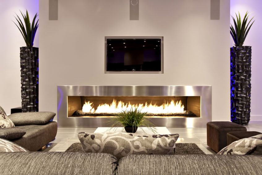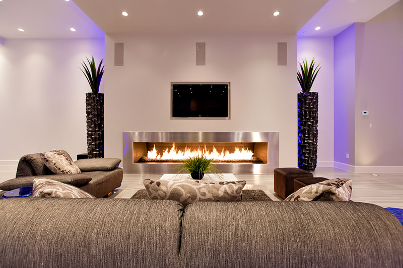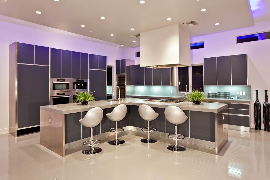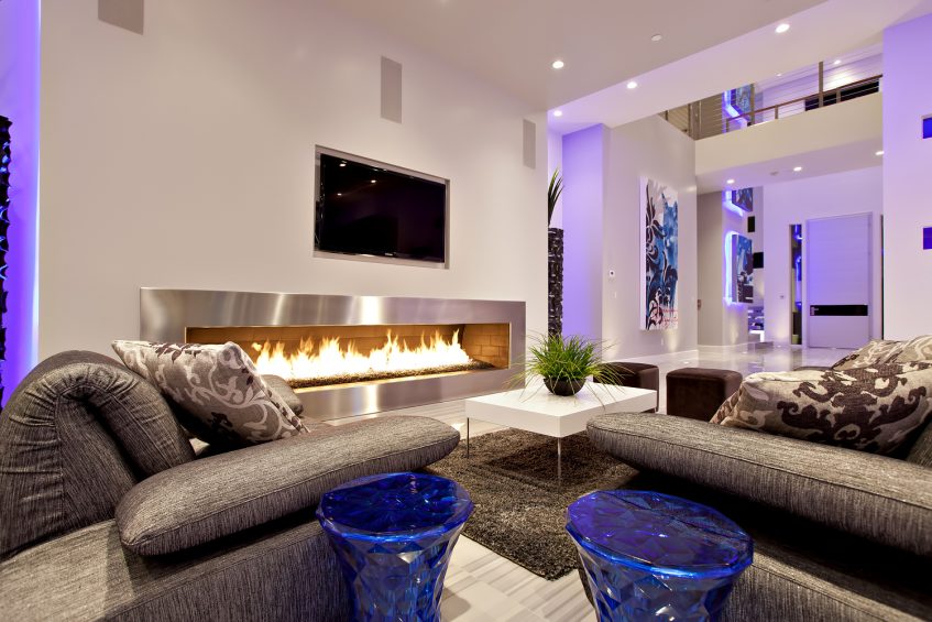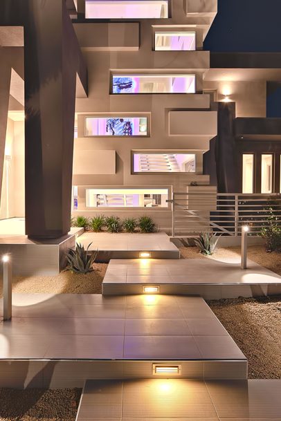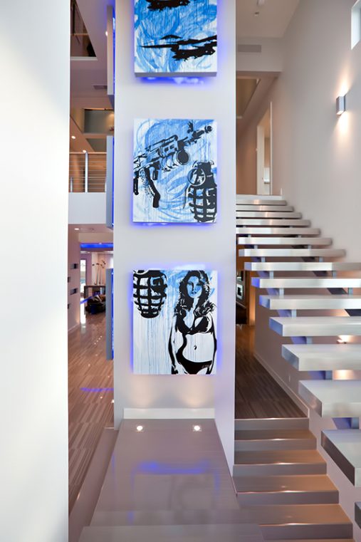 Resonating with style and panache, this unforgettable Las Vegas residence features an 11-foot custom-designed aluminum front door that opens to striped Italian floor tile, a three-story elevator tower surrounded with custom art, a floating staircase trimmed with stainless steel accompanied by Scavolini cabinets and a 14-foot wide fireplace in the kitchen along with a startlingly extensive use of glowing blue LED lighting accents throughout the home that is sure to catch your attention.