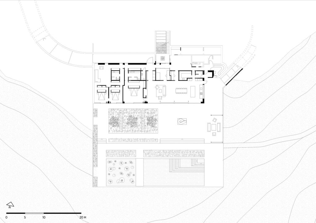 The villaβs layout creates a flow and connection between formal and informal functions and combines practicality and wellbeing. The main entrance is located on the north-west side of the building at the end of a pathway which is carved into the terrain from the parking lot. The second entrance is a small staircase with a green bright courtyard connected to a room which can be used as office guest room plus fitness room.