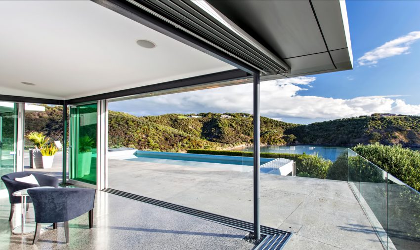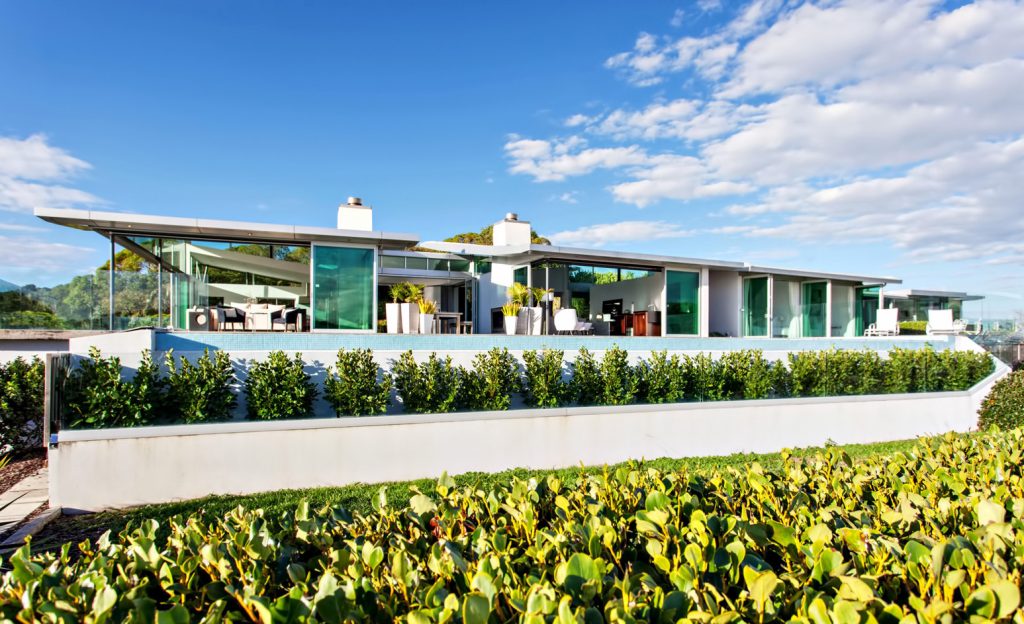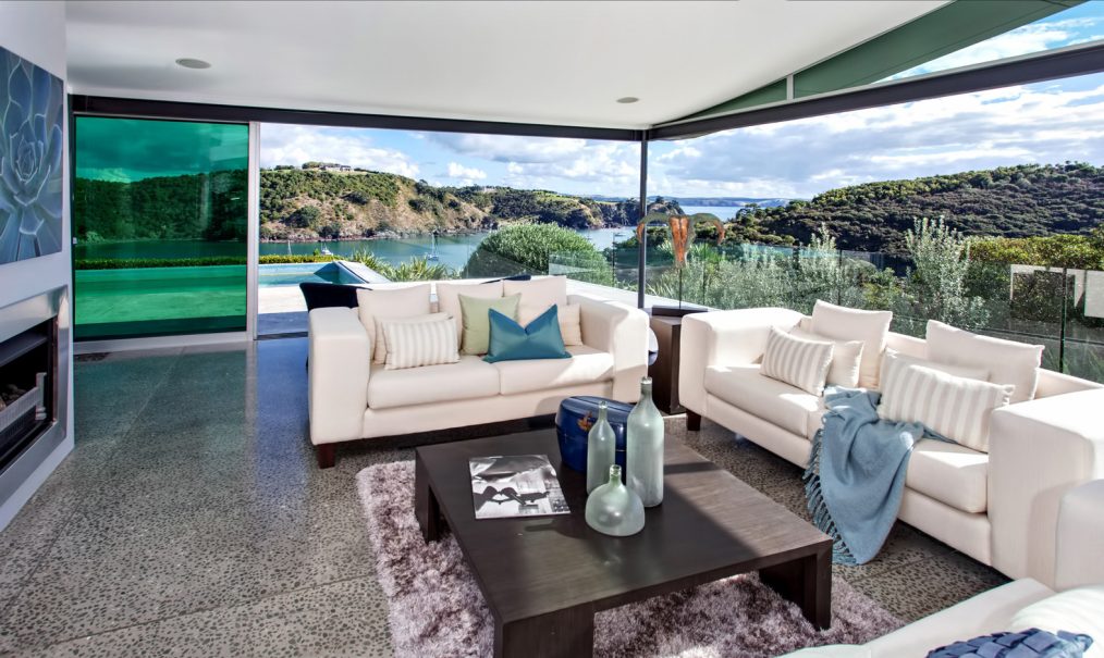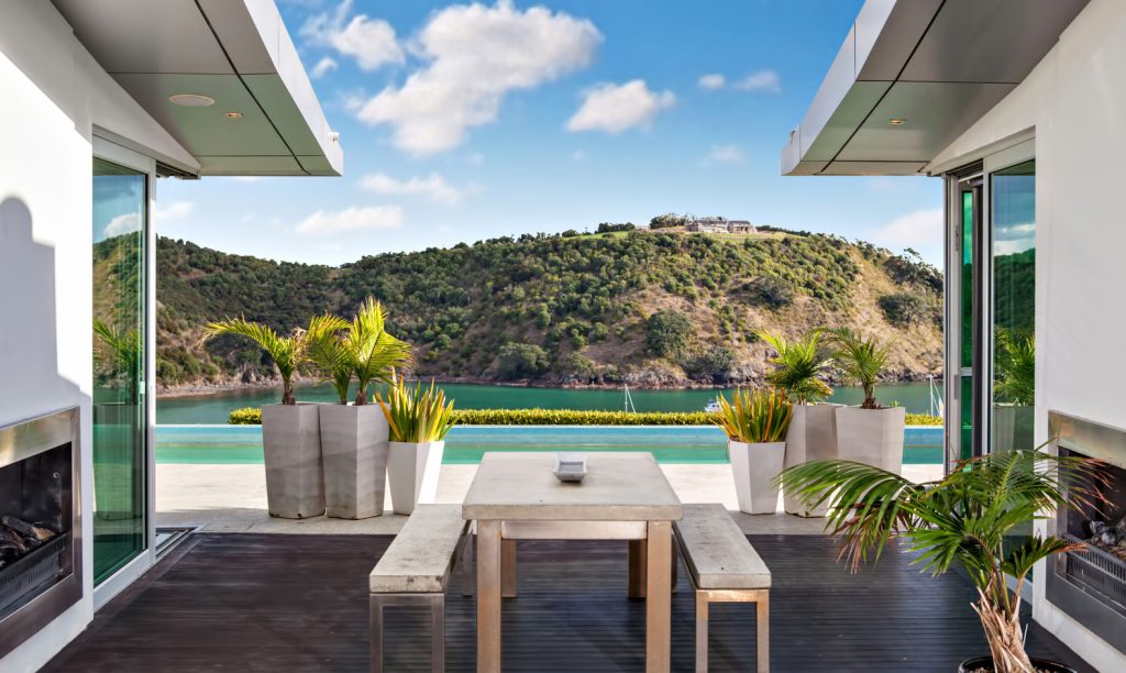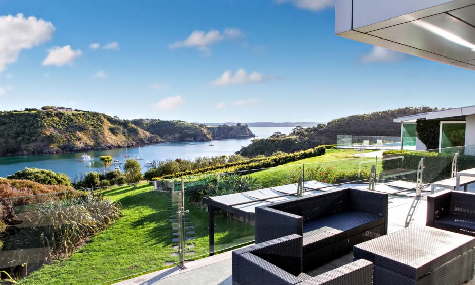 Complete with a pool, spa, tennis court, helicopter pad and a private beautifully landscaped 1.77-hectare property that was purposely built with room for venue space. The choice of living spaces includes a lounge or media room, an office with separate entrance, entertainer’s kitchen and front-facing bedrooms with terraces overlooking the bay. Double-sided gas fireplaces create ambiance inside and outdoors. There is also a separate guest space with two bedrooms and ensuite, lounge/kitchen and terrace for private use.