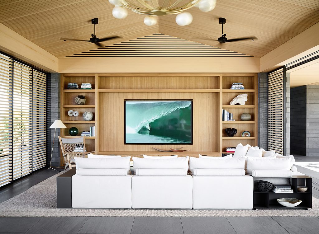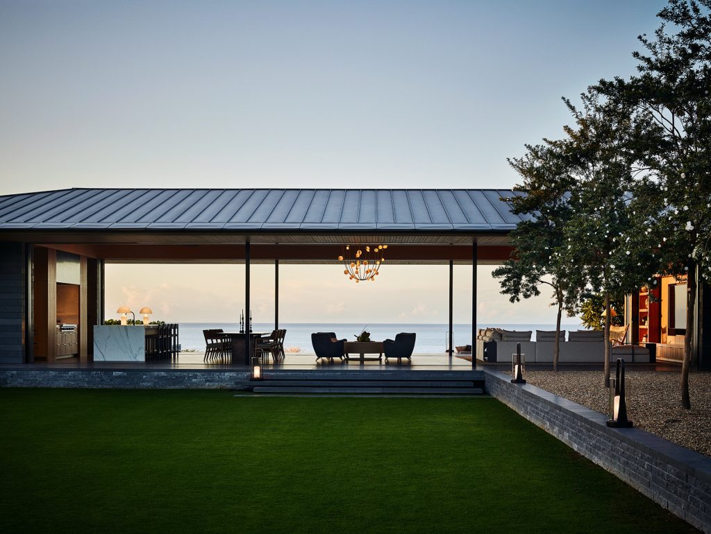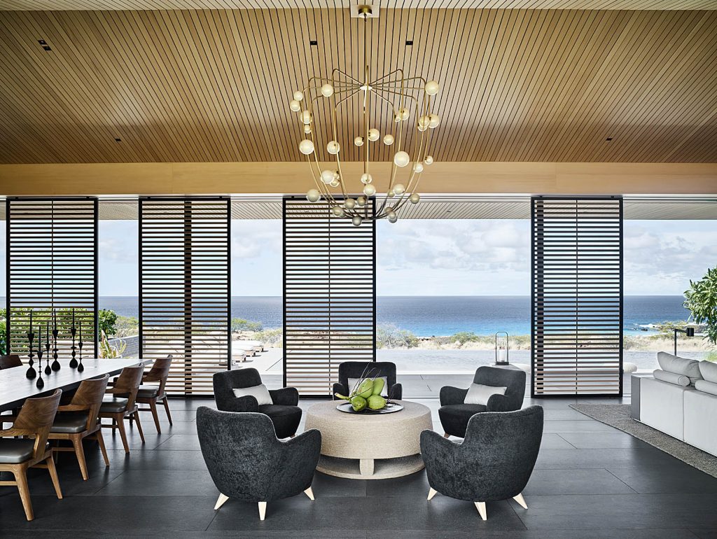 The main hale seamlessly frames the ocean with expansive floor-to-ceiling retractable glass doors and wood screens, intended to soften harsh sunlight and provide relief from trade winds without obstructing views.