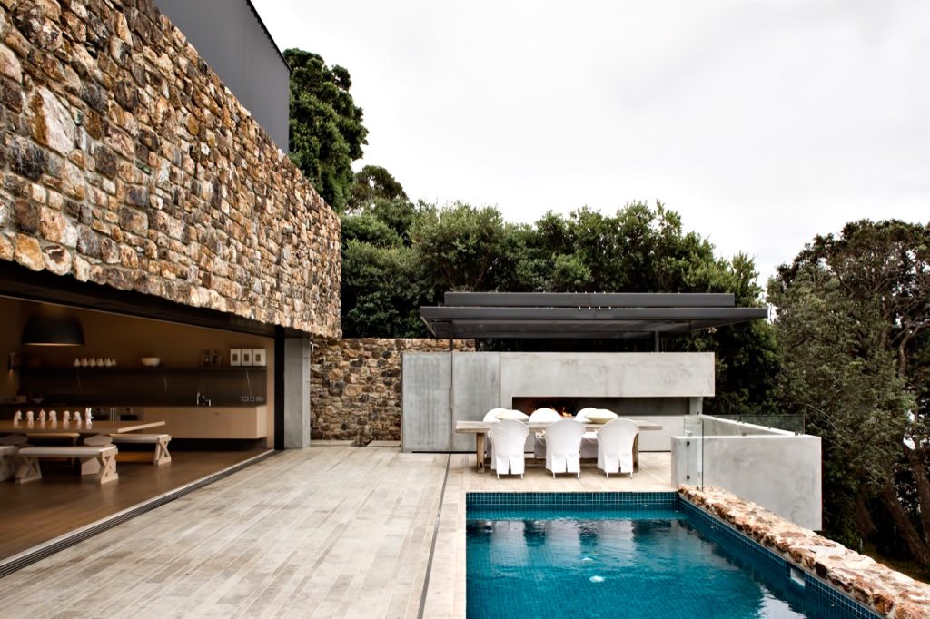 A luxury summer residence located on a steep east facing coastal escarpment just above a pohutukawa fringed white sand beach on Waiheke Island, the Local Rock house was purposely designed with a composition that seeks to create a sense of its place in New Zealand.
