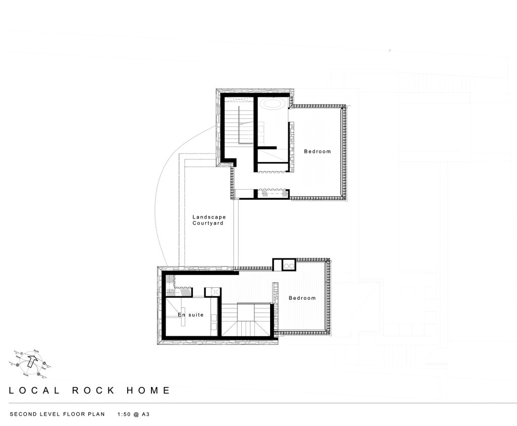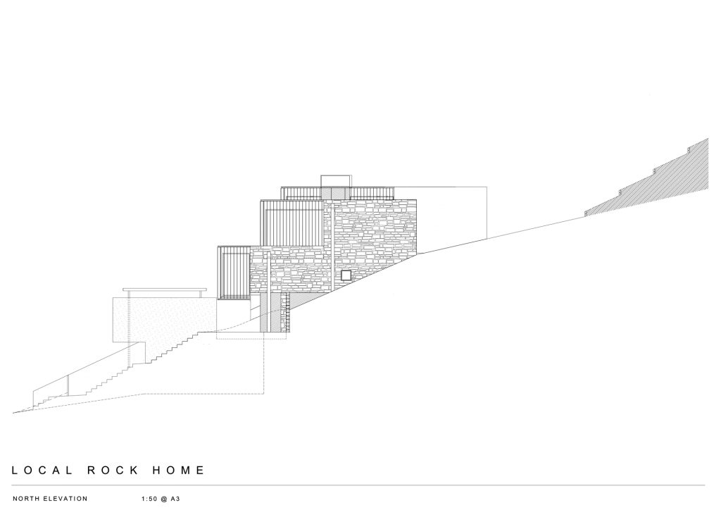 A natural rock mass forms a distinctive bridge to exploit both the sea frontage and afternoon Westerly sunlight. Under this, the living area nestles into the escarpment contrasting an intimate living terrace to the Northeast with a grotto-like western courtyard. Bedroom areas are grouped above as finely scaled louvred lookouts at the canopy level of the pohutukawas.