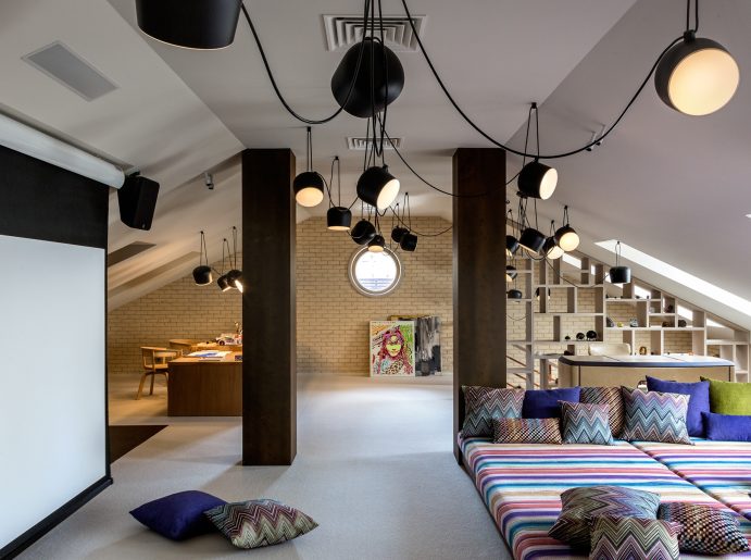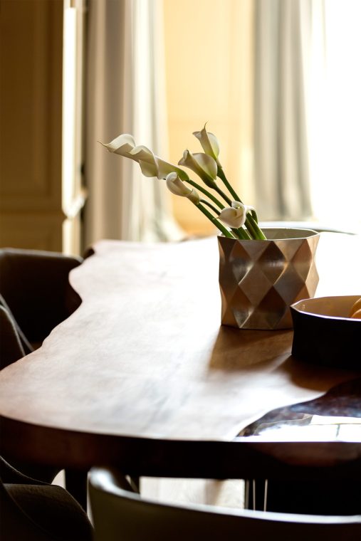 To make the interior look less dry, it was filled with design objects with distinctive character. Exquisite furniture from Giorgetti is accompanied by sculptural objects by Riva1920, a company that turns natural wood into masterpieces. Checkered rug by Vivienne Westwood made for The Rug Company incorporates all color shades used in the interior. All design details in the house are in harmony and reflect the main theme, which is of design beyond time that is never out of fashion.