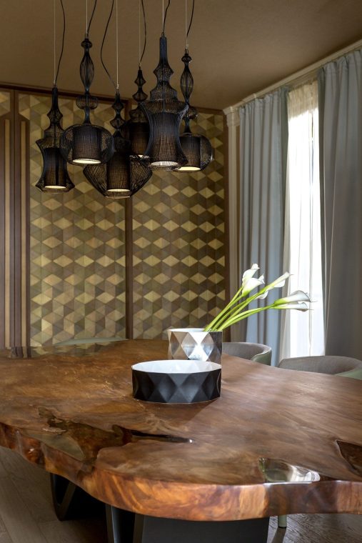 During the day, the room bathes in sunlight that comes in through huge windows, and at night the light comes from Murano glass lamps on long suspensions. The important detail of style is sliding panels between the kitchen and the dining room, manufactured by the studioβs design. They are glass on the one side and covered with colorful copper petals on the other. Delicate decorative work gives classic materials new meaning and modern delicacy. The swimming pool area is lit with lamps by Frank Gehry. A monumental panel with tortoises that symbolize wisdom and prosperity serves an additional symbolic element of design.
