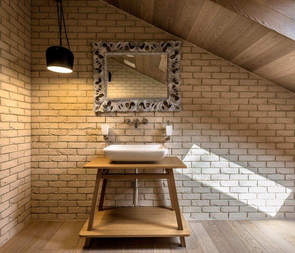 The house is designed to avoid excessive details and created an elegant, light, and modern design with an open space with high ceilings and large square area that allowed for playing with scale, proportions, and geometry. The first thing that draws attention in the living room are the ceilings, which are high enough to accommodate an impressive fireplace. To add character to the space, which is designed in soft colors, the architects opted for complex color shades when choosing textiles, furniture, and lighting. This is how the interior acquired greyish blue, soft mint, deep blue, tobacco, baked milk, and cinnamon shades.