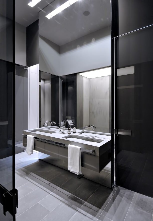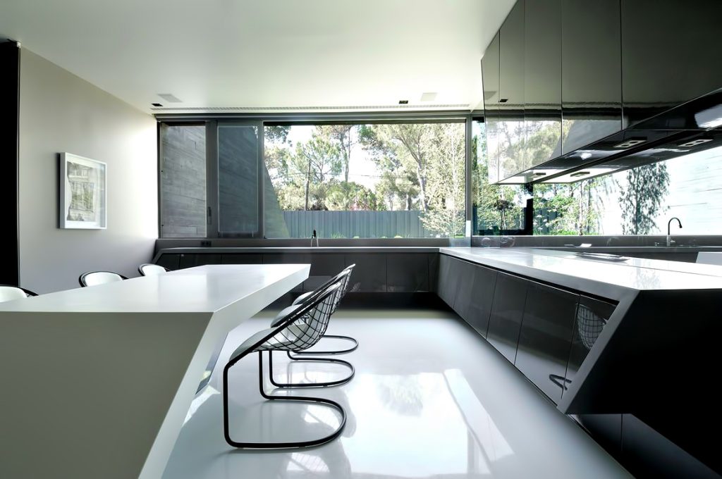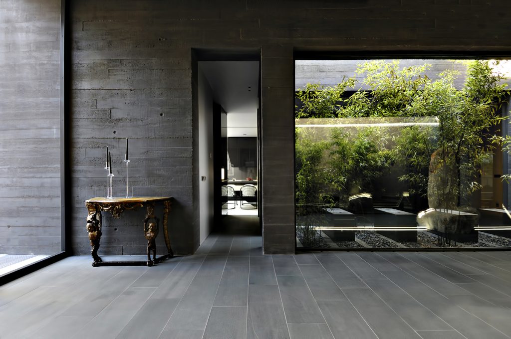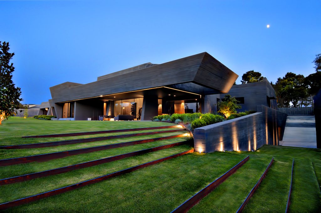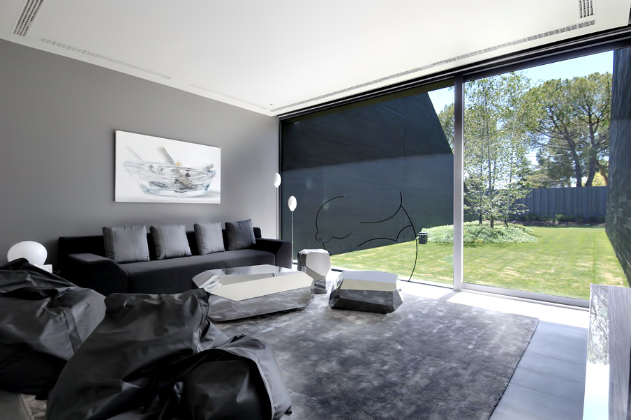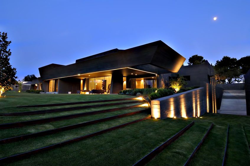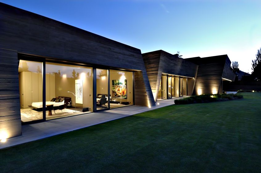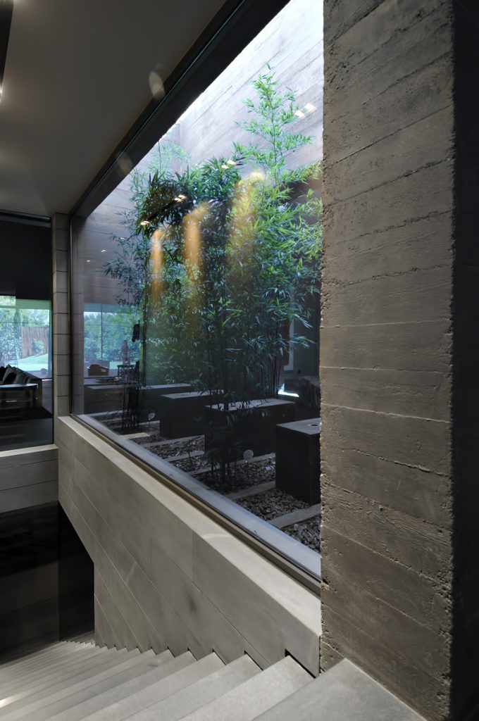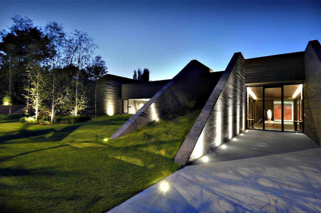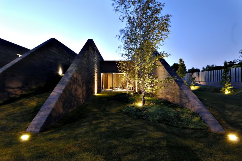 Designed as if the building is hidden between concrete spires that jut out from an organic structure, the homes façade seems almost to be hidden in a natural façade of vegetation. The back of the house is totally opened towards the garden where the lounge, dining room, library, study and bedrooms are. The bulk of the structure is intersected with wide windows that offset the concrete projections enhancing openness of the residence while also providing spectacular linear views out to the exterior areas.
