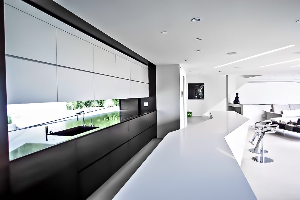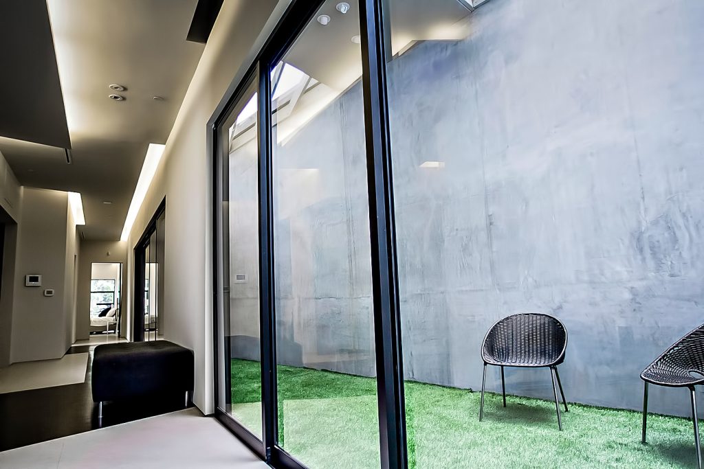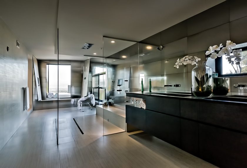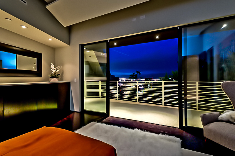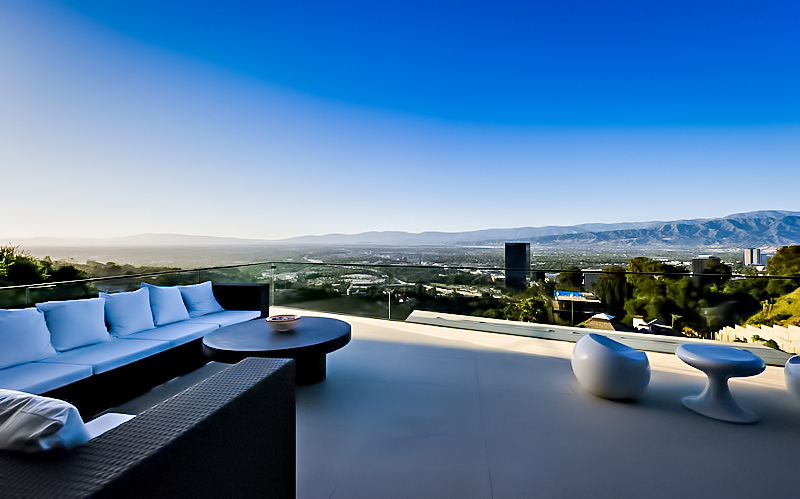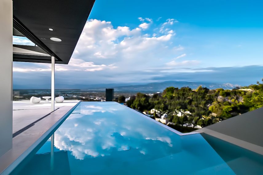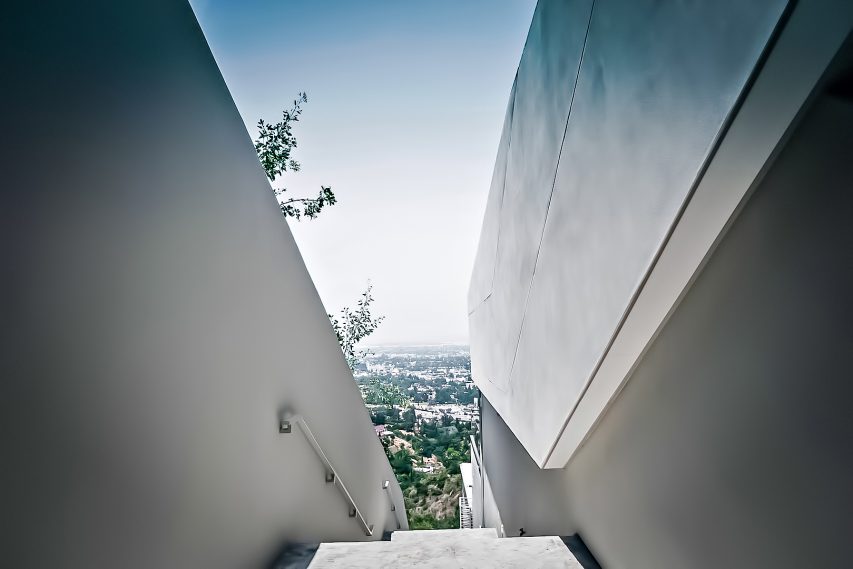 The MUL Residence was architected with a sunken profile and angular open concept design that pays homage to the principles of simplicity, beauty and serenity with a unique esthetic that separates it from the traditional architectural styles of the Hollywood Hills. Created as a contemporary masterpiece defined by the convergence of several trajectories including vertiginous terrain and the orientation of the building to provide spectacular panoramic jetliner views of Los Angeles, the residence is unmatched in its determined presence and style and is a true example of “home as art.”