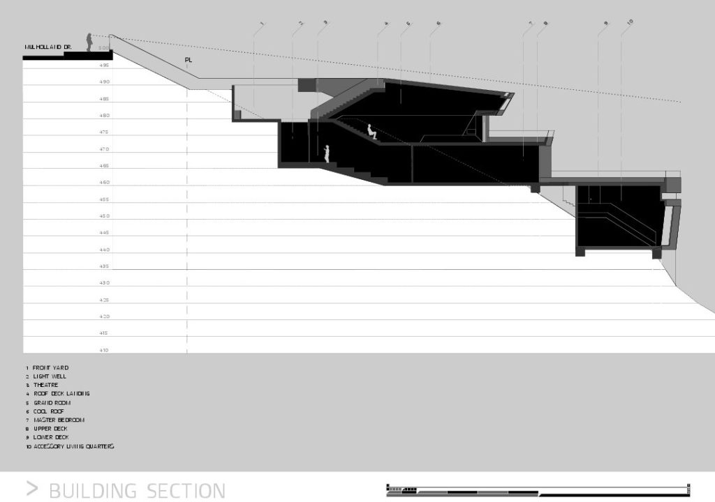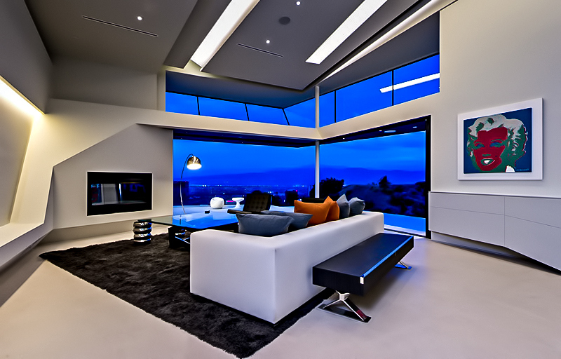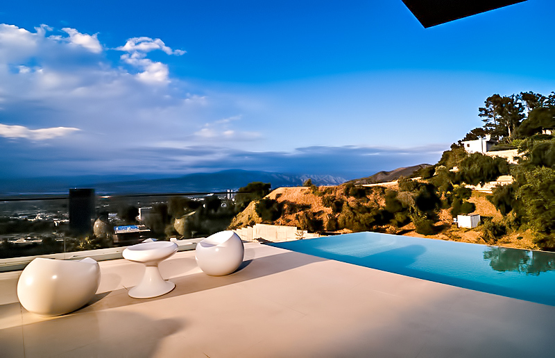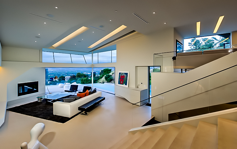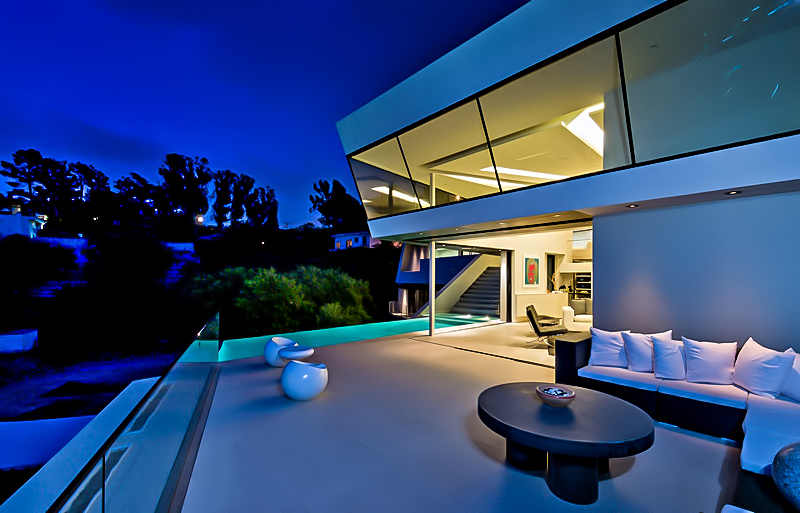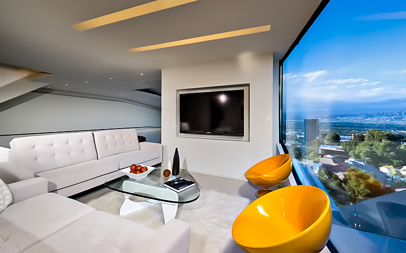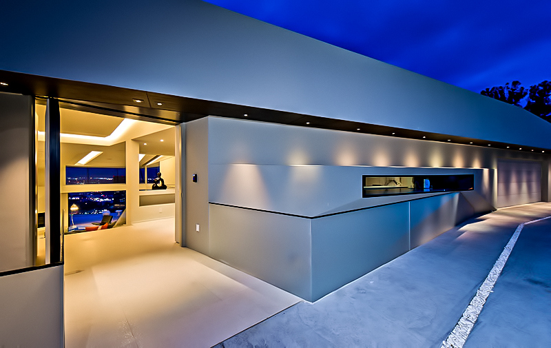 Propelled by the aspirations of the client, the stunningly bold design of this 6,065 sq. ft. luxury home was naturally conceived to meet the challenges and the physical constraints of its L-shaped lot and the steeply inclined terrain of its location. The result is a spectacular luxury residence that from the street provides an unassuming presence with a structure that seems to gently cascade down the hillside allowing each level to have superior and exclusive unobstructed panoramic views of the Los Angeles landscape overlooking the iconic Universal Studios within just a block of Lautner’s iconic Chemosphere and Errol Flynn’s infamous ‘Mulholland Farm’ ranch.