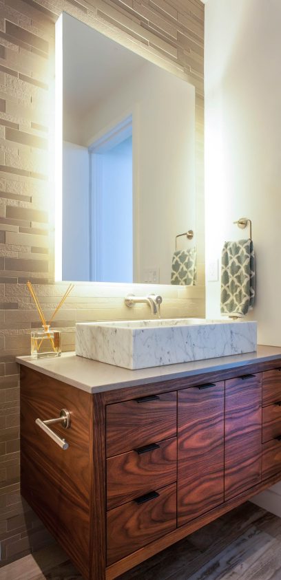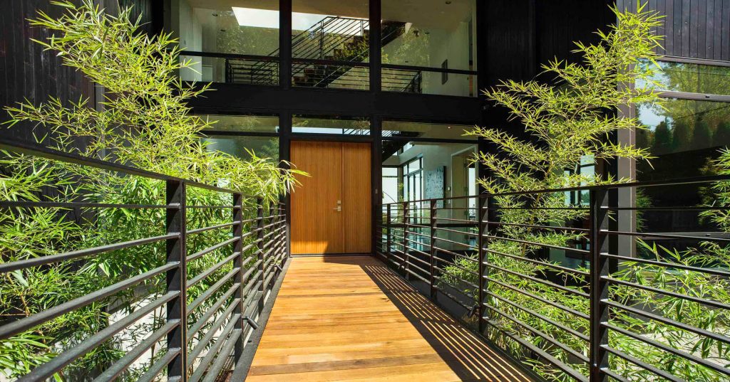 The upper level is dedicated to the couple’s children, parents, and guests. Further up, an electronic roof hatch opens to reveal a rooftop deck boasting commanding views of Forest Park, the city, and the majestic mountains in the distance. To reach the main entry, a long bridge adorned with a bamboo forest stretches from the sidewalk, providing a captivating pathway. The exterior of the residence is clad in black stained siding, reminiscent of the traditional Japanese technique called sho sugi ban, or charred wood, paying homage to the clients’ Japanese heritage.