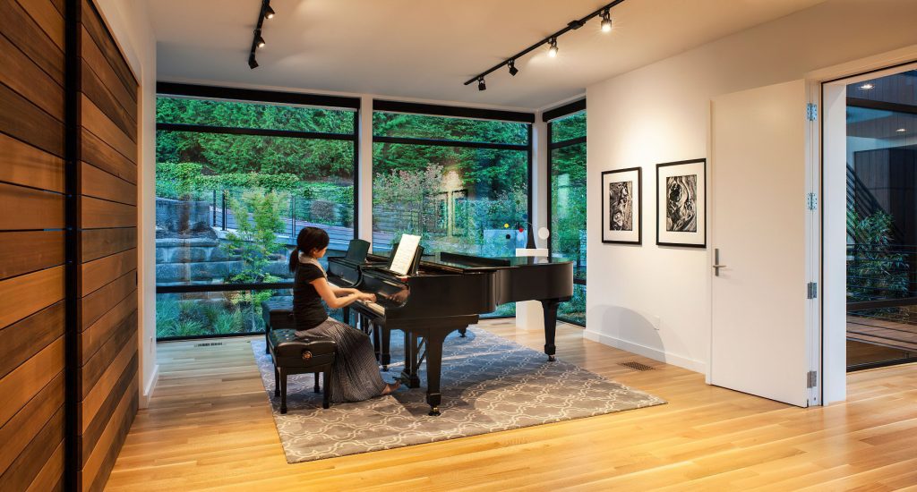 On the lowest level, nestled against the hill, the percussion room caters to the husband’s passion as a timpanist in the Oregon Symphony. This spacious area accommodates a diverse range of lively percussion instruments. On the main level, discreetly tucked behind the exterior bamboo garden, the piano studio awaits the wife’s students, providing a serene space for learning and practice. As one ascends the stairs, an operable skylight unfolds to reveal a spacious balcony and a roof deck with uninterrupted views to the north, providing a serene space to unwind and appreciate the beauty of the surroundings.