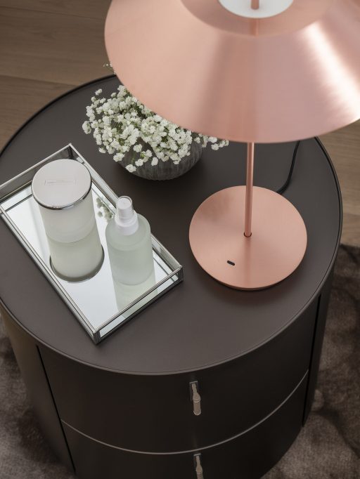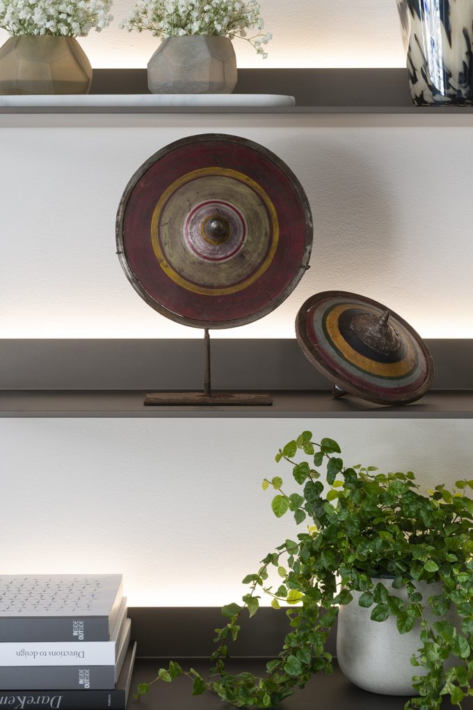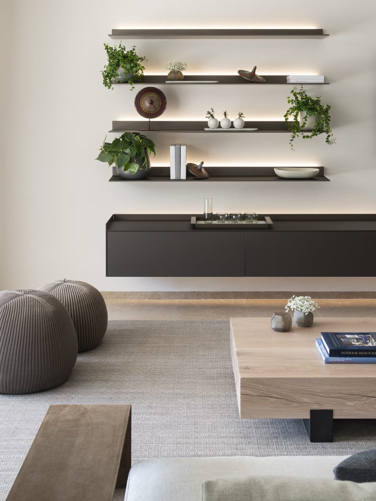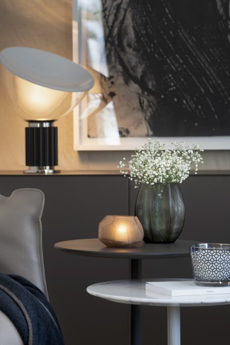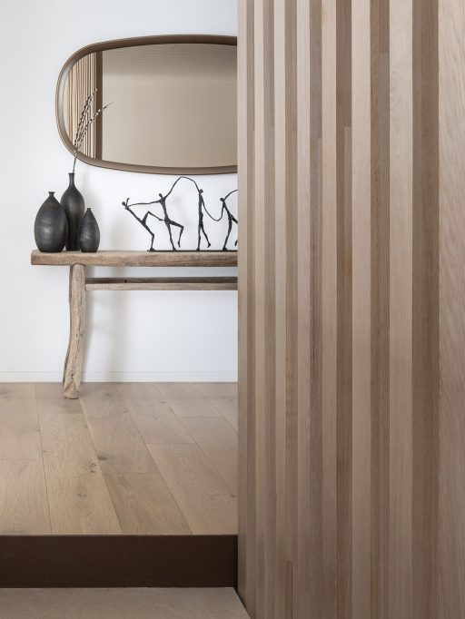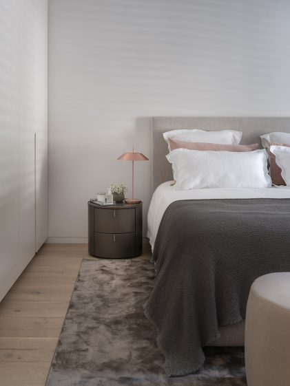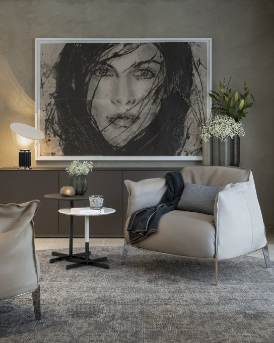 Walking into the home’s entrance, they created a small living space with a featured treatment wall to meet guests with a warm welcome. Right off the bat, the tone of the interior design is set – neutral tones, luxurious materials and an overall sense of elegance. This cozy corner at the entrance is made complete with two enveloping armchairs from Poltrona Frau and a statement painting from Lidia Masllorens that grabs your attention right away.