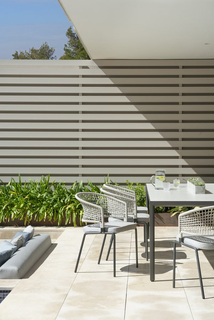 Outside, furniture fills two separate seating areas and a dining area. Comfortable upholstered seating with clean lines and deep blue accents make the space feel connected to the home’s interior making for a seamless way of living. A dark finish was chosen for the framing of the outdoor furniture to connect with the window frames and indoor dining area, too.