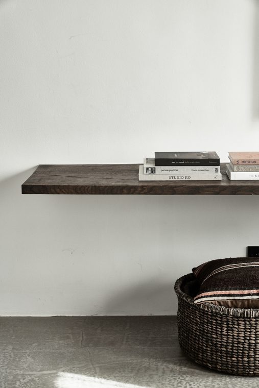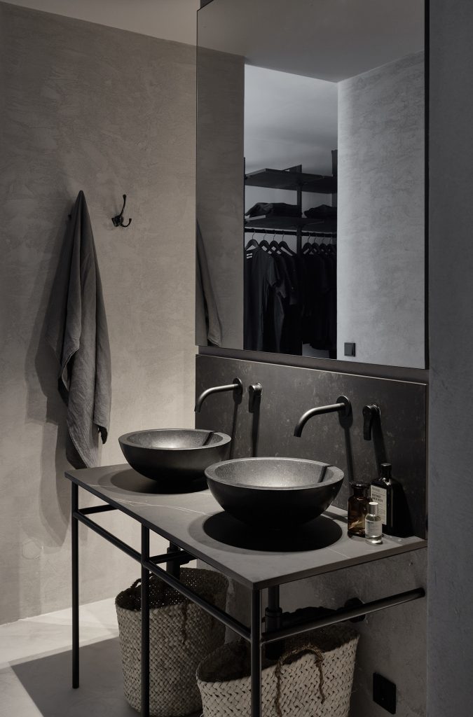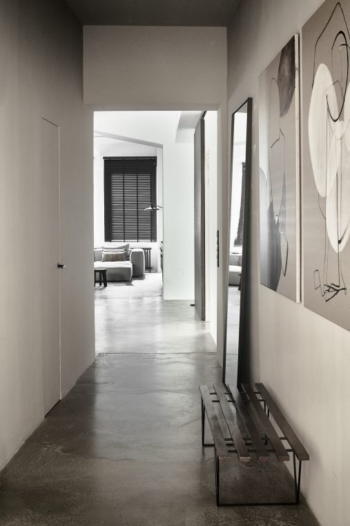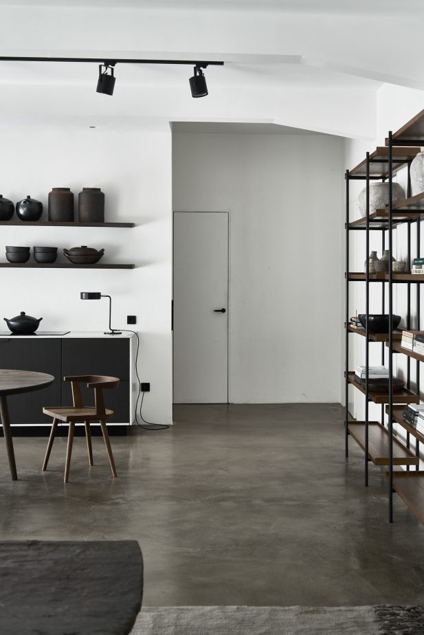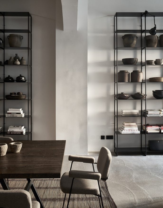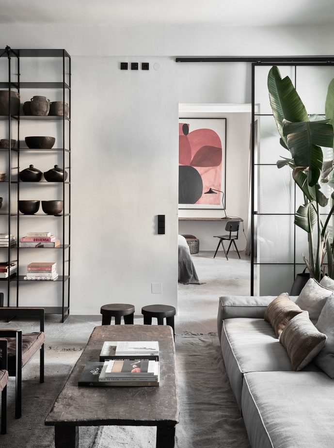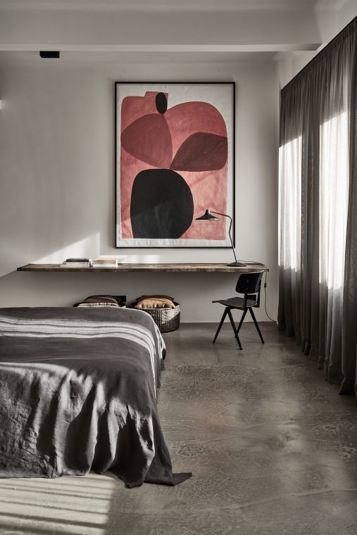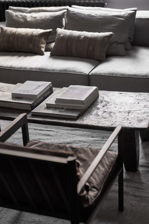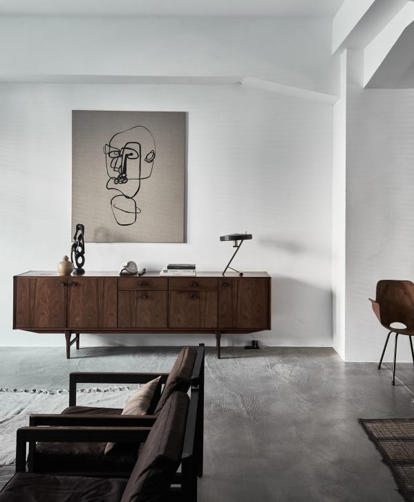 A composition of custom-made interiors, wooden furniture, rough linen and carpets, selected mid-century vintage finds and unique objects complement the general monochrome and understated design concept.