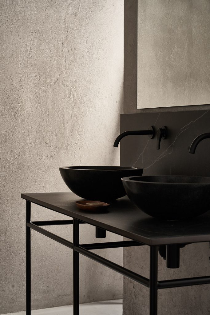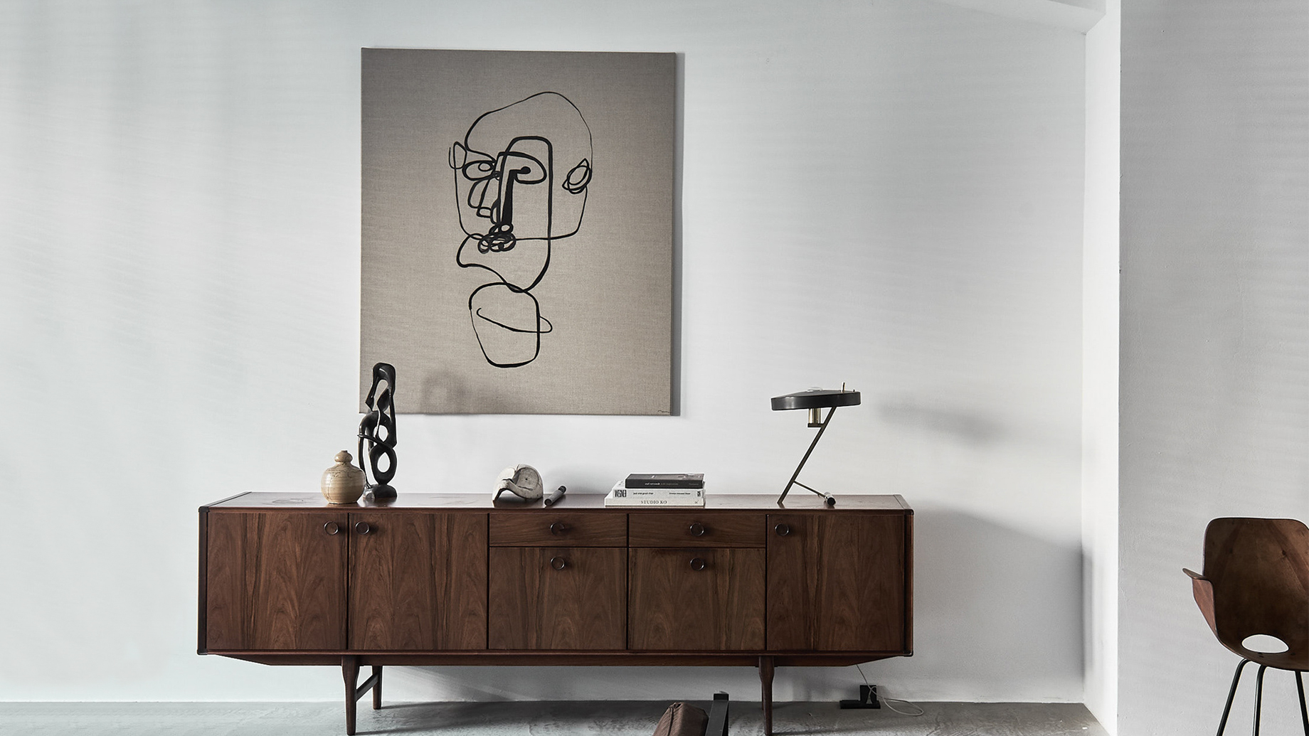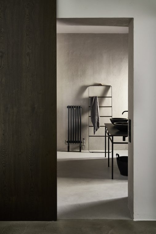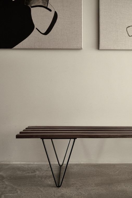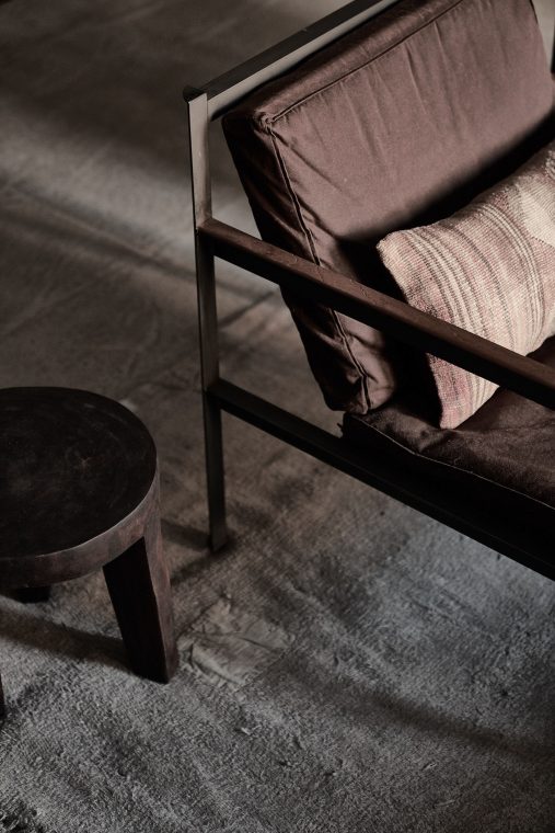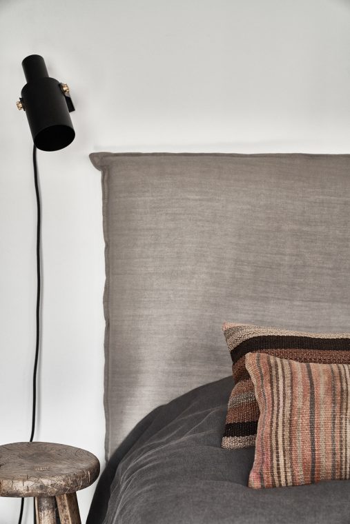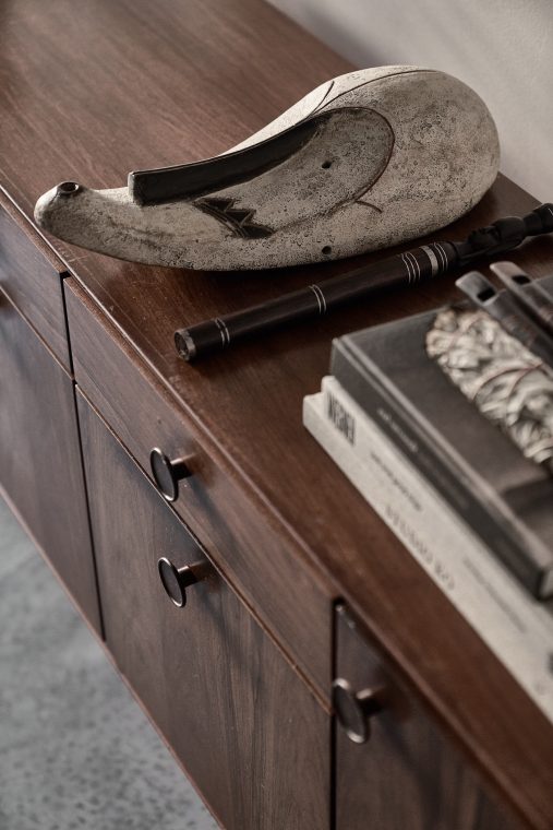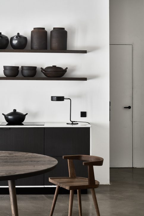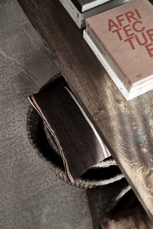 A composition of custom-made interiors, wooden furniture, rough linen and carpets, selected mid-century vintage finds and unique objects complement the general monochrome and understated design concept.