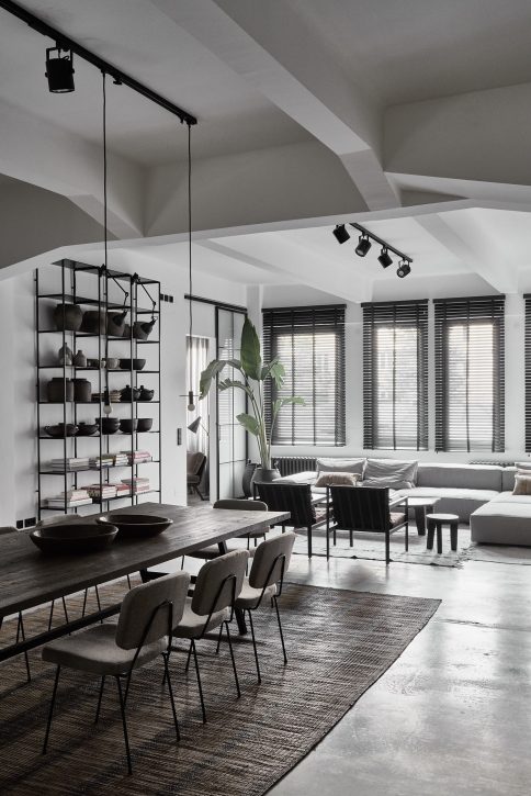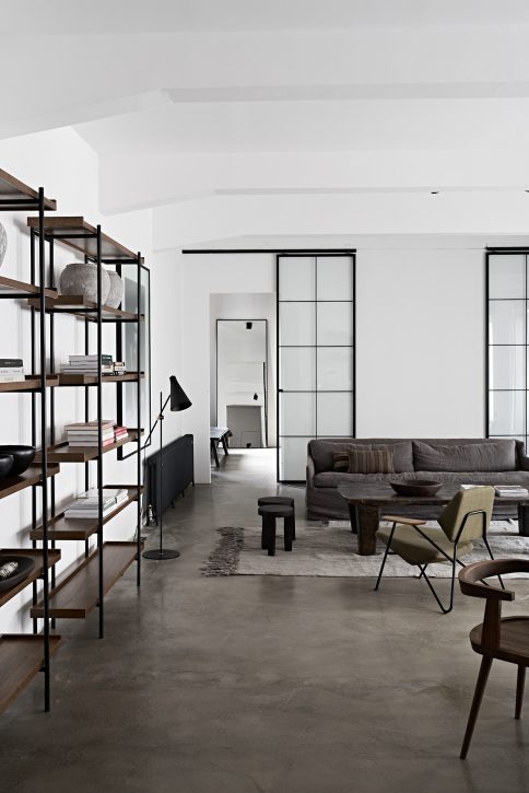 The apartment is divided in two units with seamless connection through wooden sliding doors. High ceilings and big windows create an overall spacious feel. The bright open-plan living, kitchen and dining space is the center of the apartment where friends come together for long dinners and endless talks.
