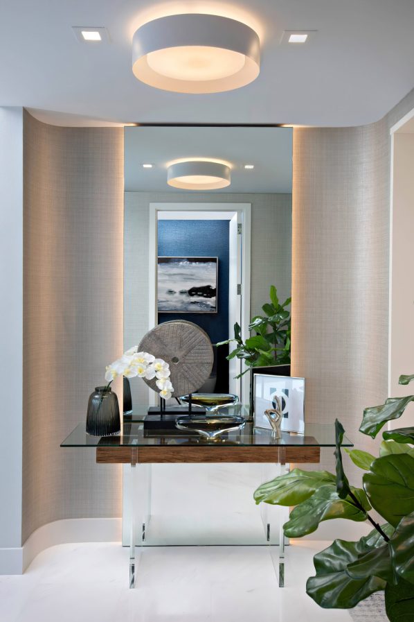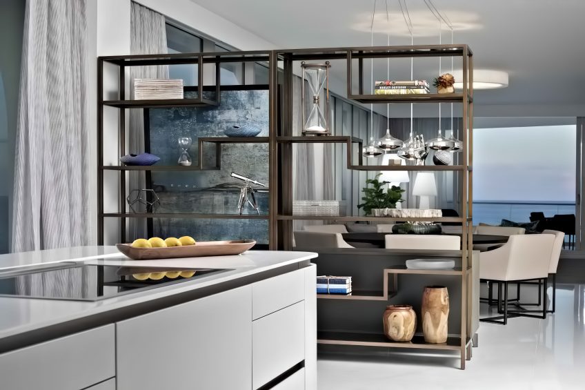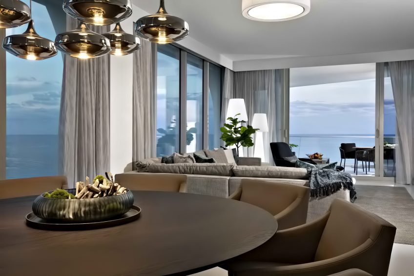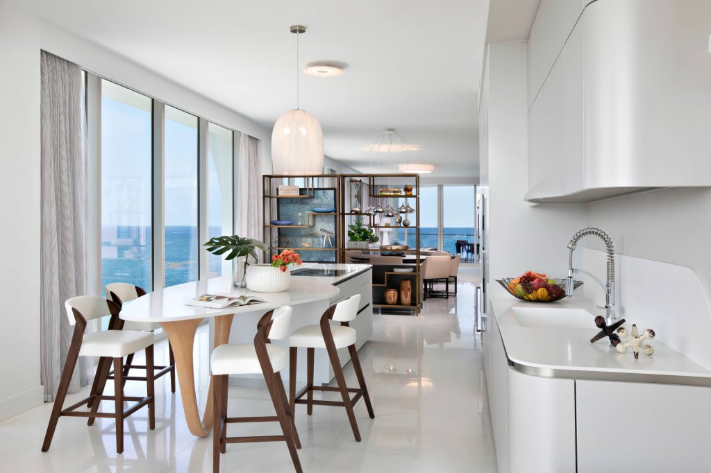 Each space was meant to encourage rest and relaxation through calming modern style, streamlined furniture selections, and a tranquil color palette. Functional interiors enhance every interaction between family members and their visitors, making the most of the apartmentโs spaces and stunning views of the Atlantic Ocean.