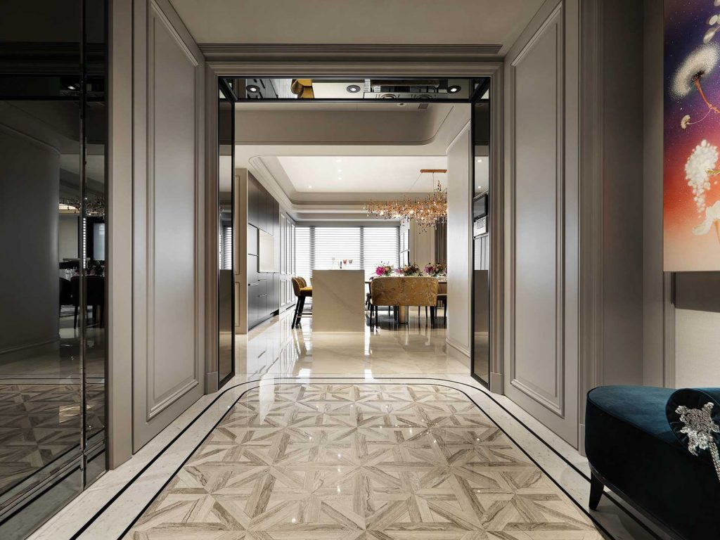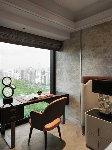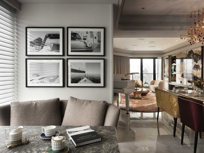 In the heart of Taipei, Taiwan, the One Park 15 luxury apartment stands as a testament to the exquisite craftsmanship of L’atelier Fantasia. The interior design showcased across the living spaces blends contemporary elegance with an artistic touch that speaks volumes of the design firm’s mastery over luxury and comfort. The living room is an epitome of grandeur, featuring an expansive mural that is both a statement piece and a harmonious part of the decor. It serves as a backdrop to the sophisticated furnishings that include plush seating and a warm, inviting fireplace, adding a sense of tranquility to the modern living space.