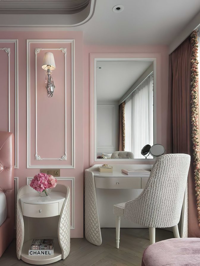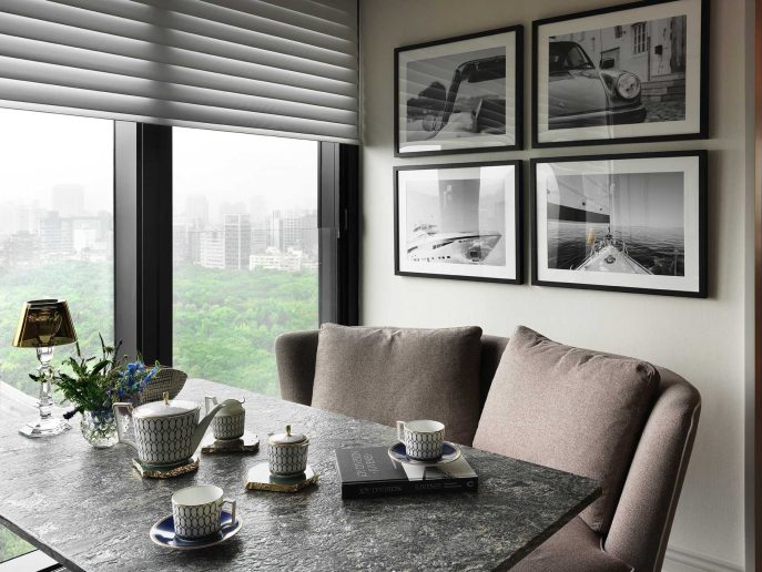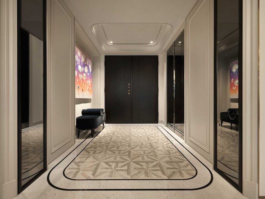 The attention to detail is evident in the transitional spaces throughout the apartment. Hallways are adorned with tasteful art pieces and furnished with elegant seating, turning every walk through the apartment into an immersive experience. L’atelier Fantasia’s One Park 15 project is a true celebration of modern luxury, where every detail works in concert to create a living space that is not just seen but felt, embodying a sense of home that is both lavish and warmly inviting.