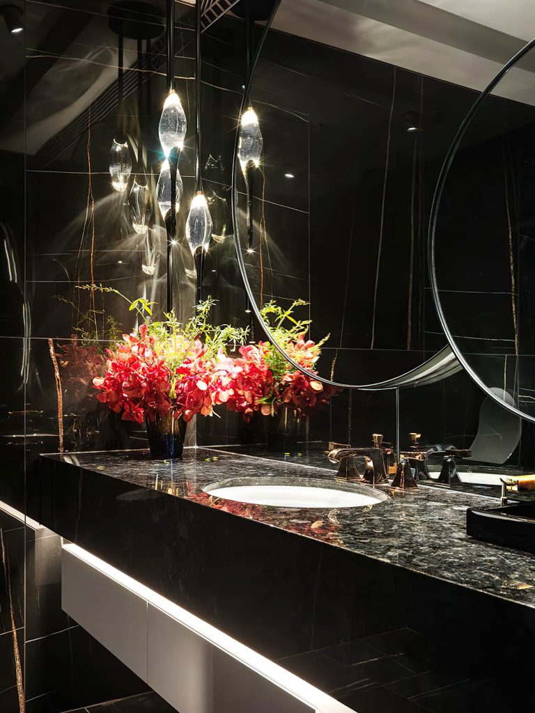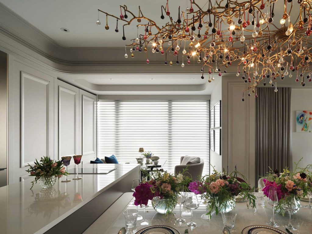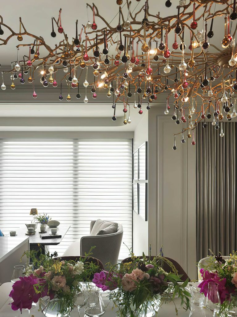The ingenuity of the design extends to the dining area, where a sleek, reflective table complements the unique overhead lighting fixture, a constellation of glowing orbs that seem to dance in a silent symphony above. This area merges seamlessly with the kitchen, boasting a clean, minimalist aesthetic without sacrificing functionality. The neutral color palette is accented by bursts of vibrant colors from the floral arrangements, creating a dining experience that is both visually stunning and intimately comforting.