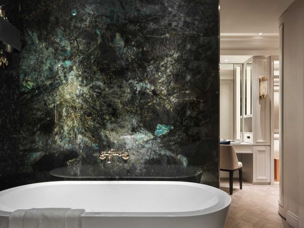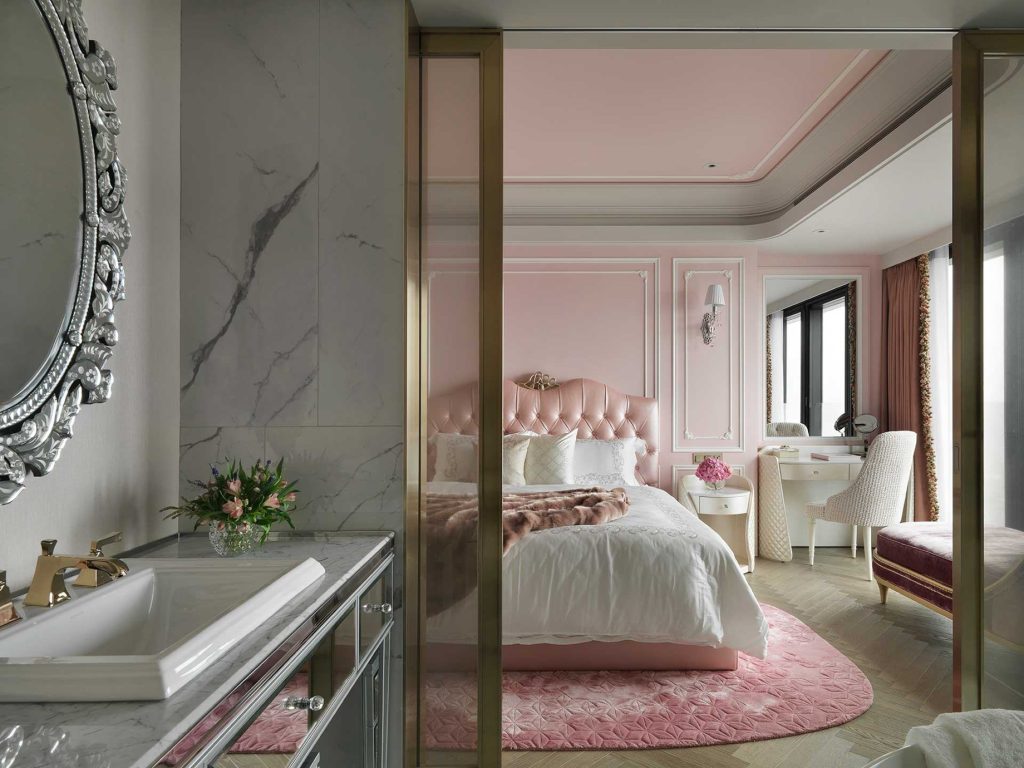The bedroom and bathroom continue the theme with an opulent luxury motif. The bedroom strikes a balance between opulence and comfort, with soft lighting that highlights the textured walls and rich, fabric-lined furniture. Strategic lighting in shelving units adds a touch of warmth, making the space feel like a personal sanctuary. In the bathroom, the modern fixtures and the sculptural quality of the lighting design combine to create a space that feels more like a spa retreat than a mere functional area.