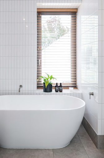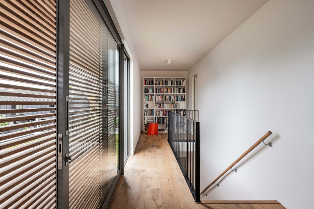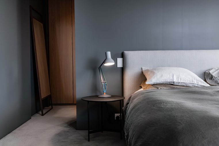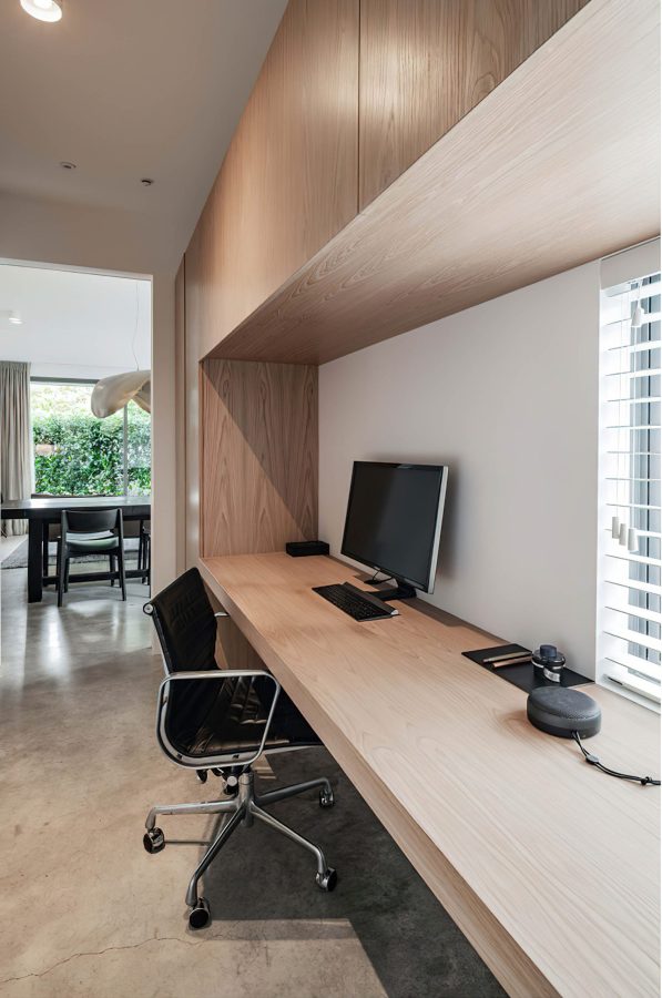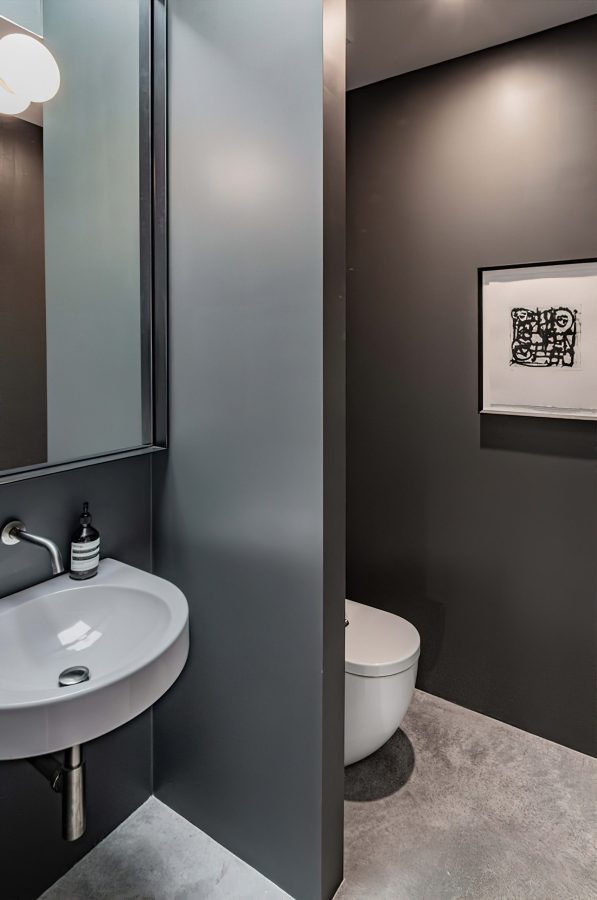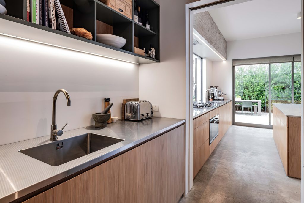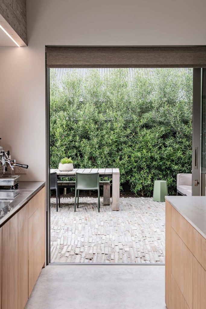 The master bedroom, painted a deep grey-green, opens to the north and east, offering a restful escape from the city. Each of the three ensuites has a skylight over the shower, while concrete-finish ceramic tiles meet American oak cabinetry and granite vanities. The house’s design elements, such as the burnished concrete floor, American oak veneer kitchen/scullery, and imported stone paving, demonstrate the architect’s attention to detail. With its intentional connection between interior and exterior elements, the house’s design creates a sense of community that is similar to the connections between occupants and passers-by in the terrace houses of Darlinghurst.