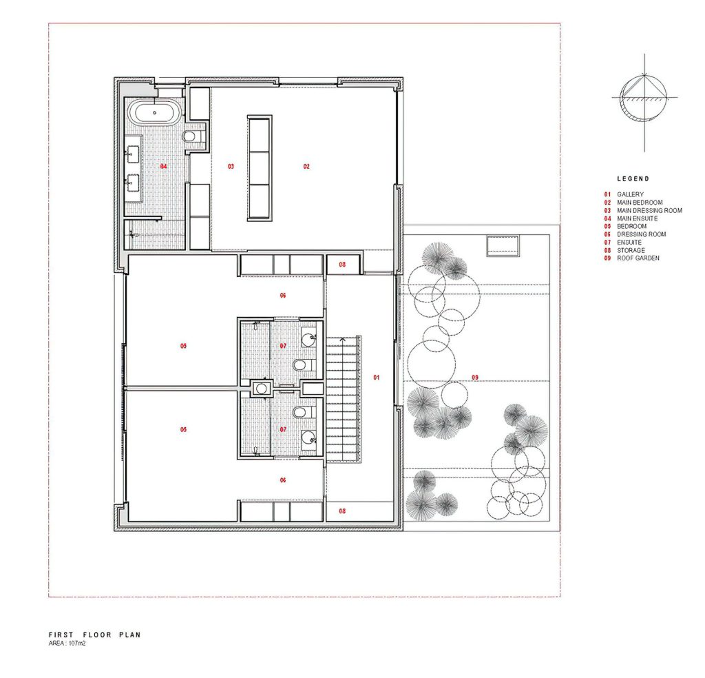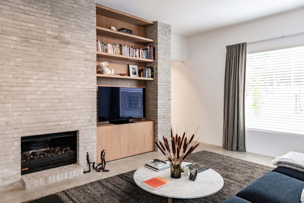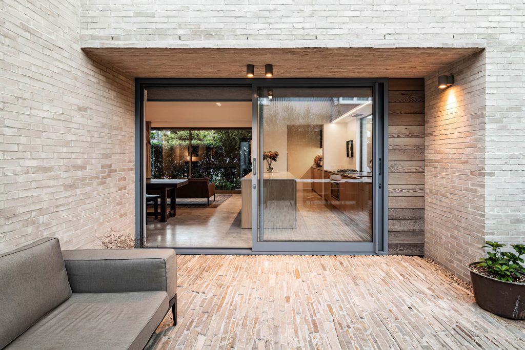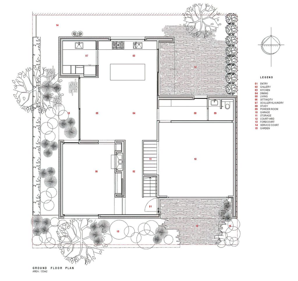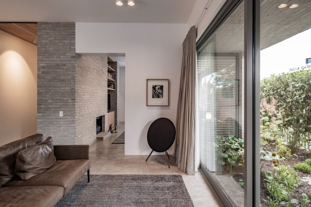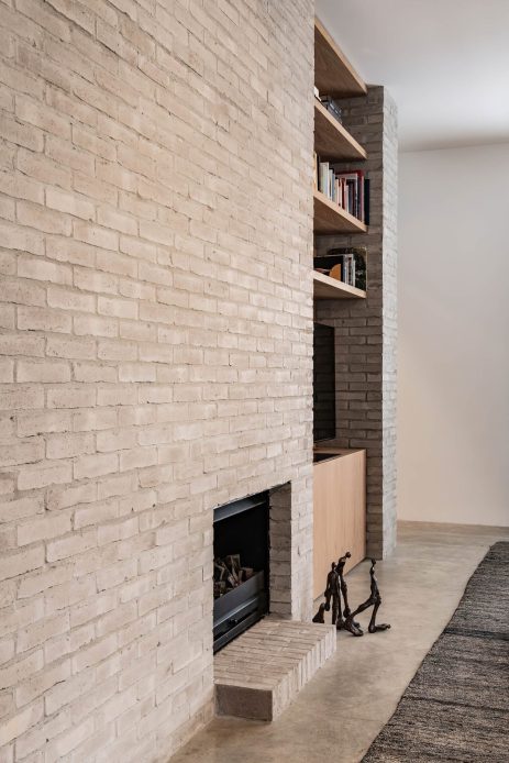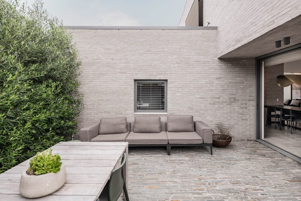 The design of the house articulates an interplay between cuboid forms offset with terraces at ground and first-floor levels. The living room window directly faces the street to the south, inviting interaction between passers-by and inhabitants. The kitchen and main dining area open onto a courtyard planted with olives and fragrant star jasmine. Split stone imported from Greece blends seamlessly with the tonal variation of the brick, creating a cohesive textural setting.