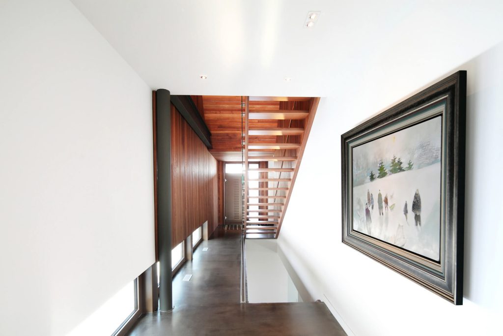 This contemporary home stands out for its striking, towering design. The house is securely embedded in rock, but the volume of white wood gives the impression of rising from the ground as the lower level is elevated on large cement pilings. A wooden walkway connects the home to the parking area, adding to the aerial aesthetic of the structure. The upper level appears to take flight with its projecting galleries, and the highlight of the project is the massive overhanging living room that overlooks the slopes of the Massif. The formal design is achieved through the use of a steel structure, which the client wanted to be visible, particularly the bracings that frame the landscape.
