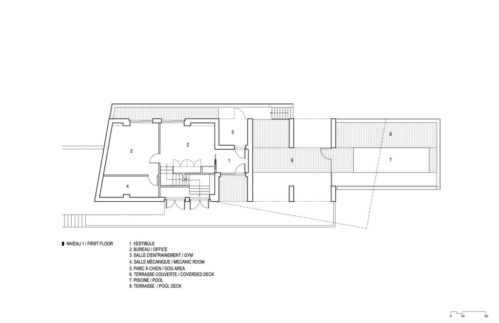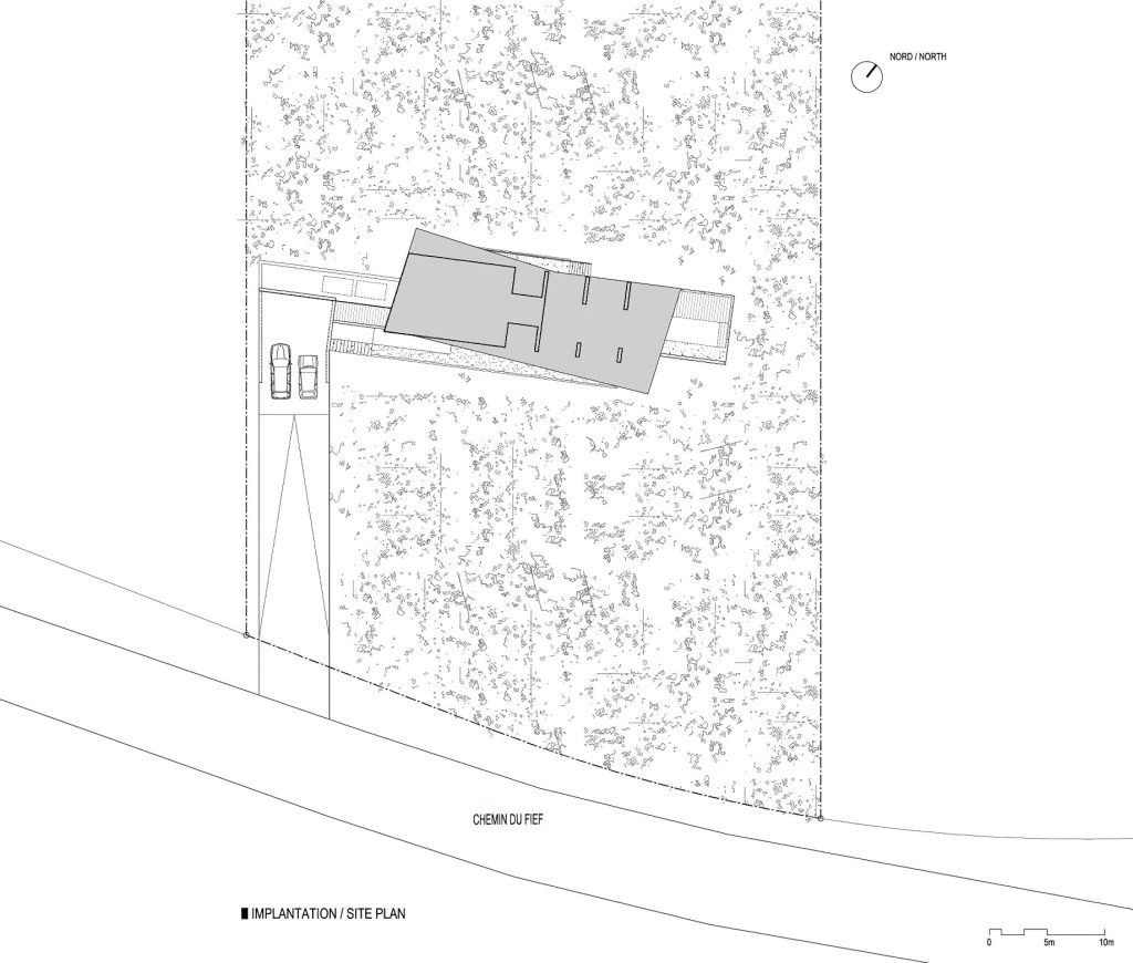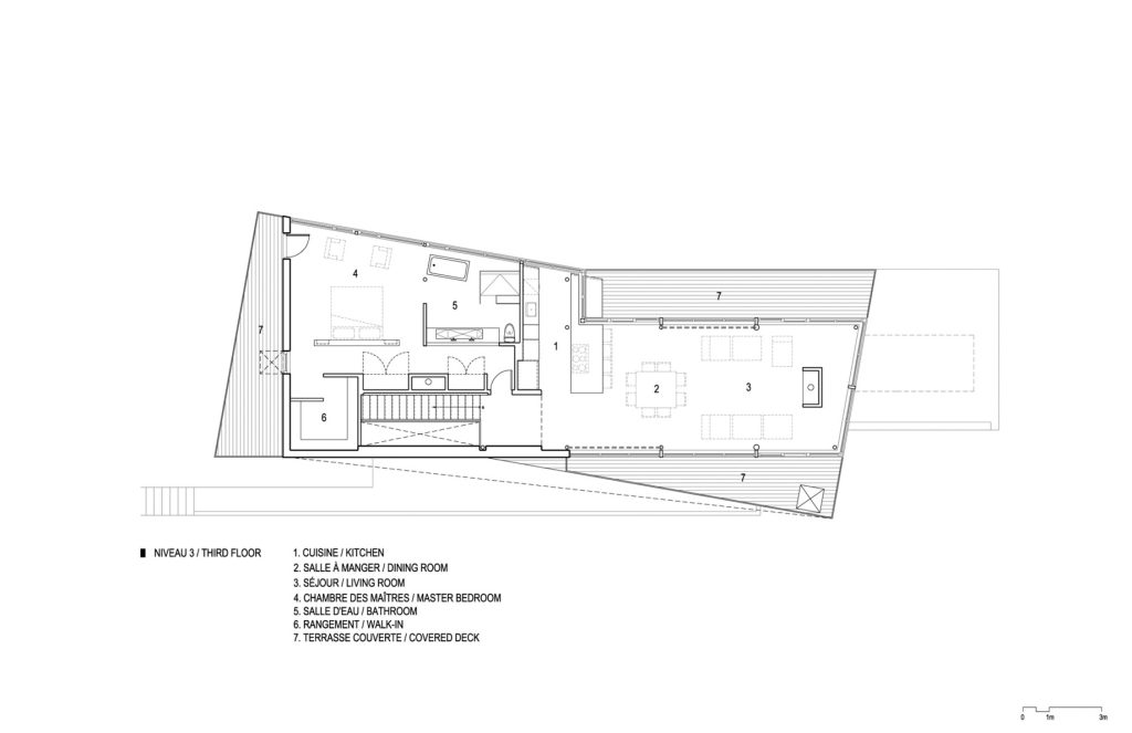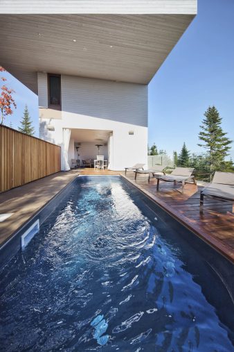 The Grands Jardins home, located in Petite-Rivière-St-François of the Charlevoix region, is nestled on a rocky wooded mountainside overlooking the St. Lawrence River, close to the Massif ski station. Careful consideration was taken in positioning the house to optimize privacy and views. The house is parallel to the street and angled to face south towards the river, giving the inside a ship-like feel. The three above-ground levels of the river-facing side elegantly rise with a play of angles and glass, while the deep slope of the site allows for the top level to be visible from the street. Inspired by contemporary Scandinavian villas, the formal lines and use of materials such as white wood and red cedar laths make a striking statement in the Quebec landscape while also seamlessly blending into the surrounding environment.
