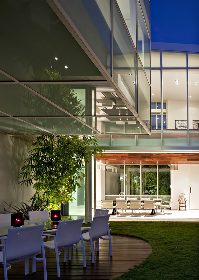 Comprising a series of distinct, yet interlocking rectilinear volumes conjoined by a transparent longitudinal axis, the residence surprises and delights with skillful interior design and exterior framing.