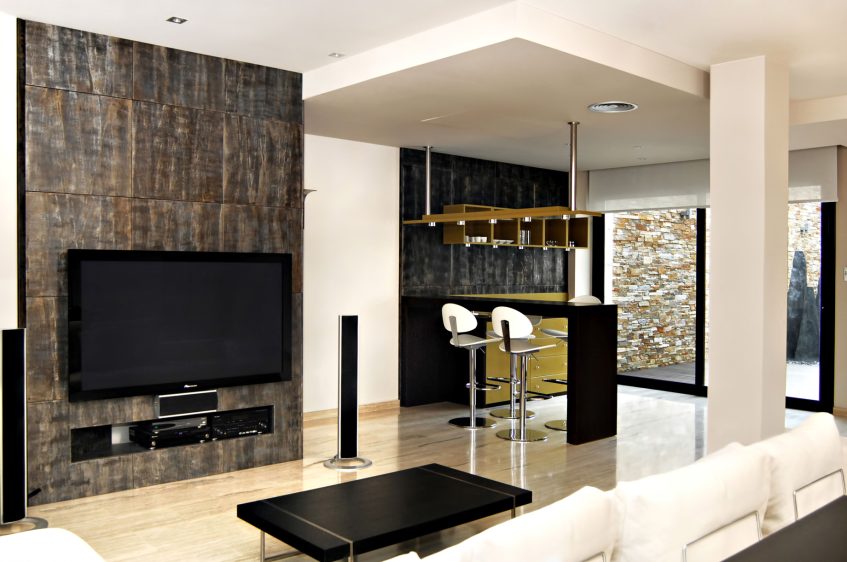 The contemporary residence was designed with clean, smooth architectural delineations that include large windows, which cast ample natural light into the rectangular volumes of the living areas while preserving the privacy of the owners.
