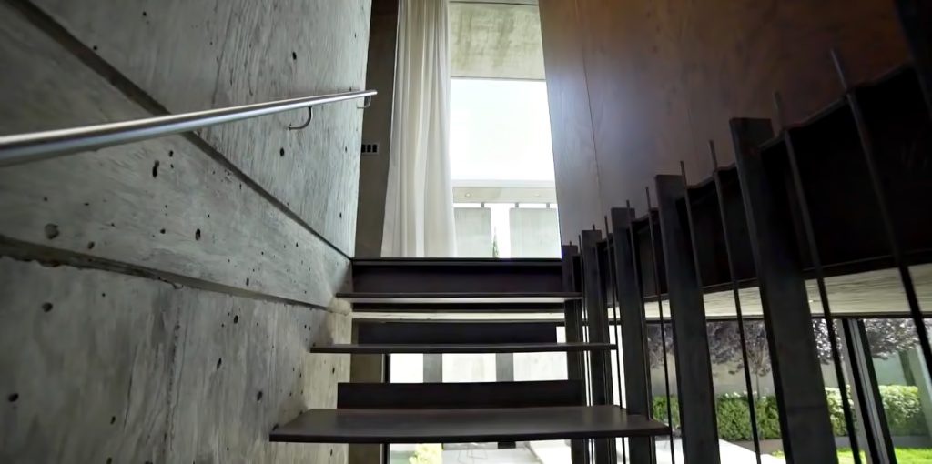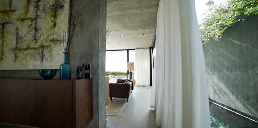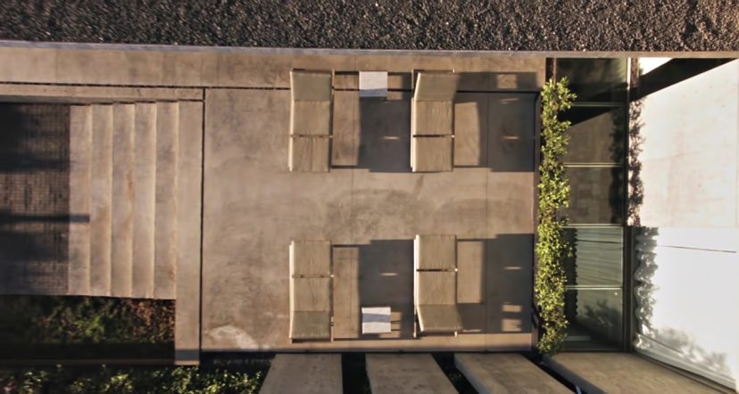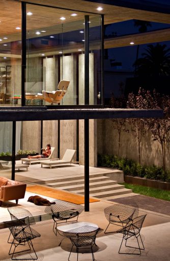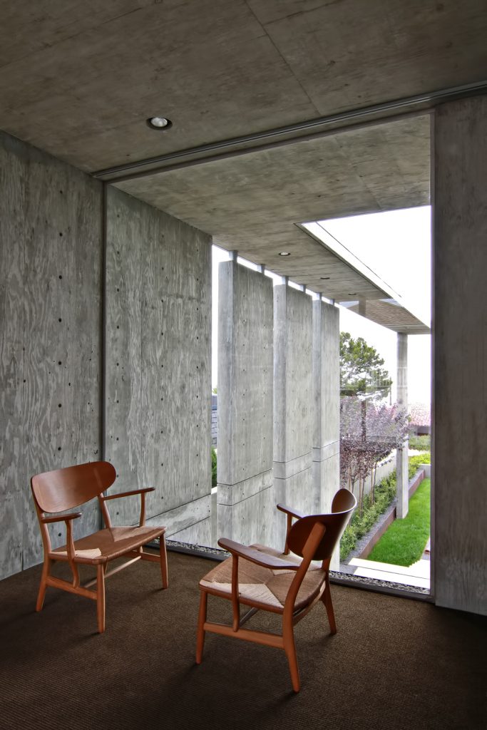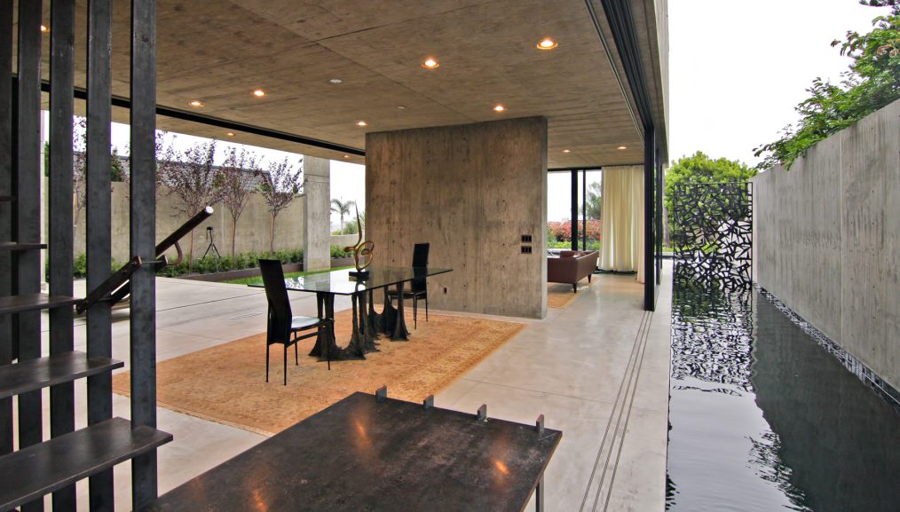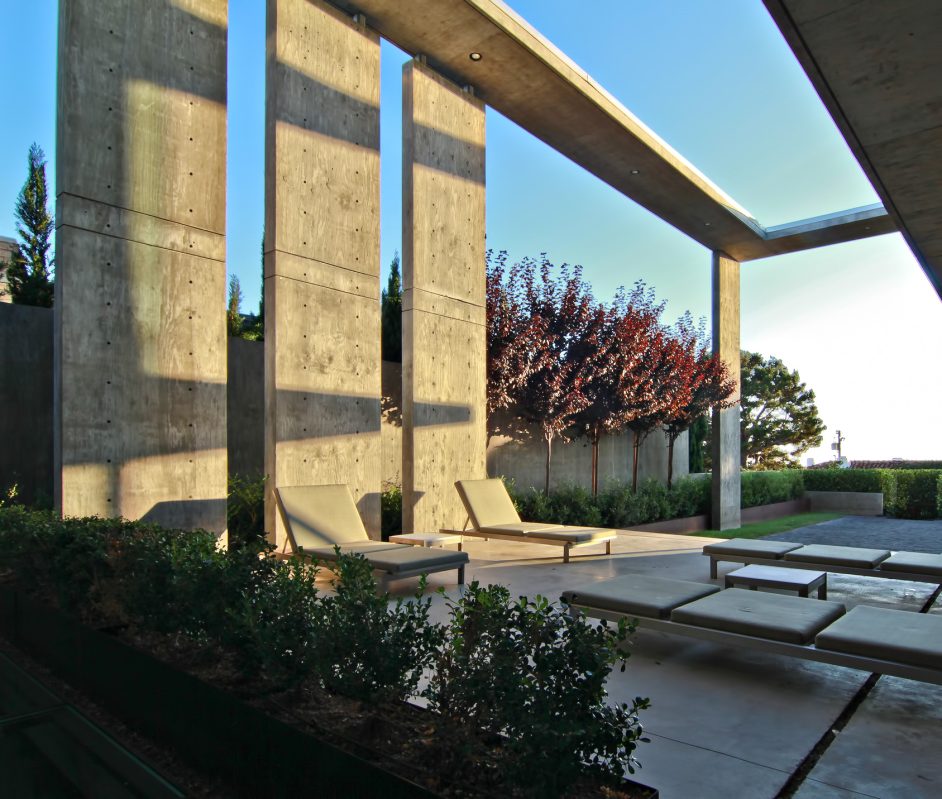 Designed from a solid form with voids, the final concrete shell structure still maintains the exterior edifice through roof planes and vertical walls that establish both the interior and exterior volumes of the residence. The exterior lounge area was a key element in creating a home that exudes a larger private atmosphere that would otherwise have felt small and constricted. While this space creates openness, the buildings overall form is kept intact with all four corners remaining in place with walls and roof planes to define the original box of the residence.