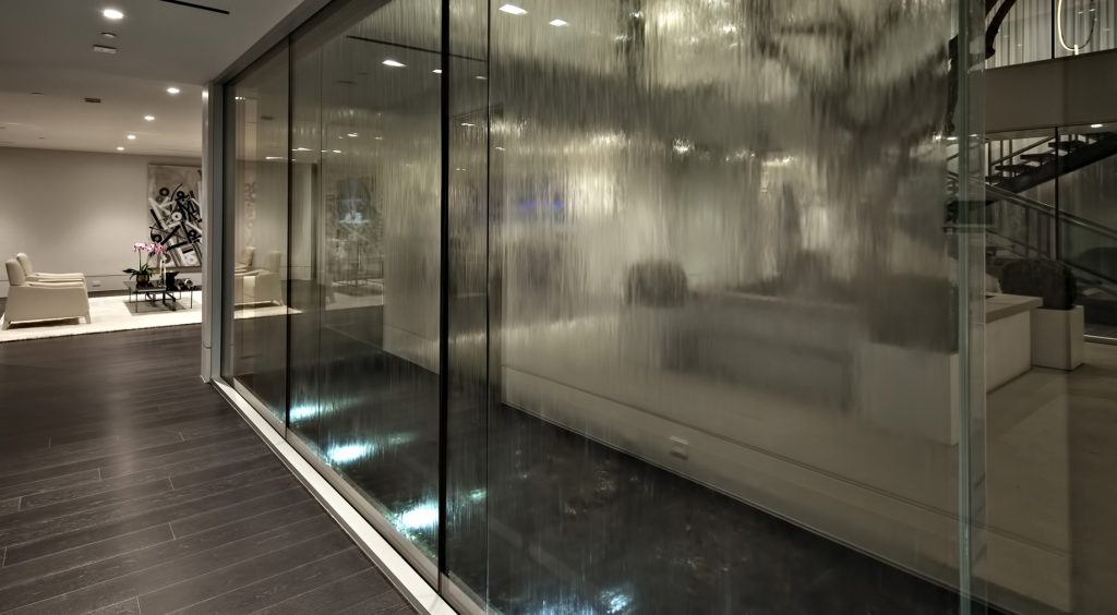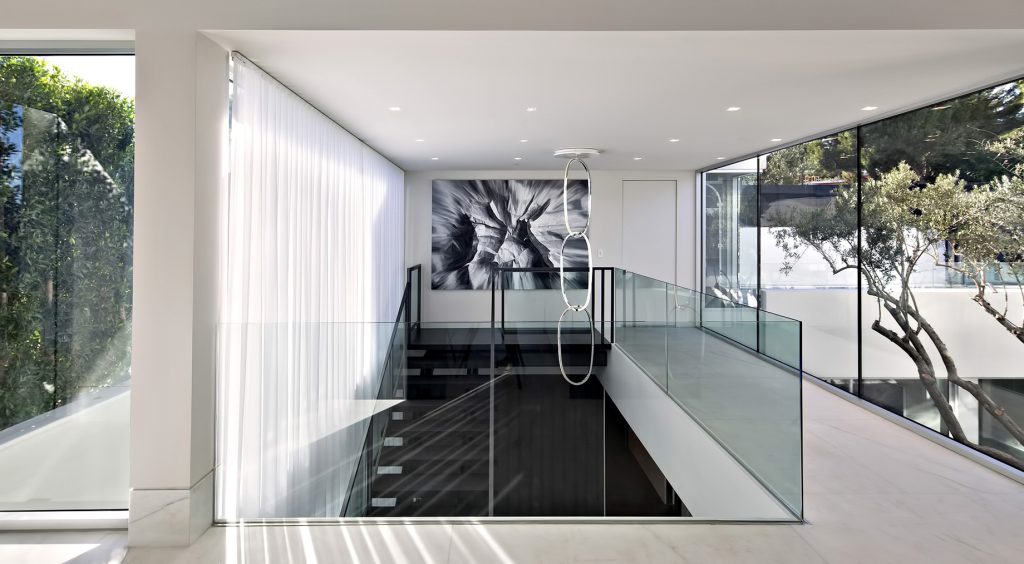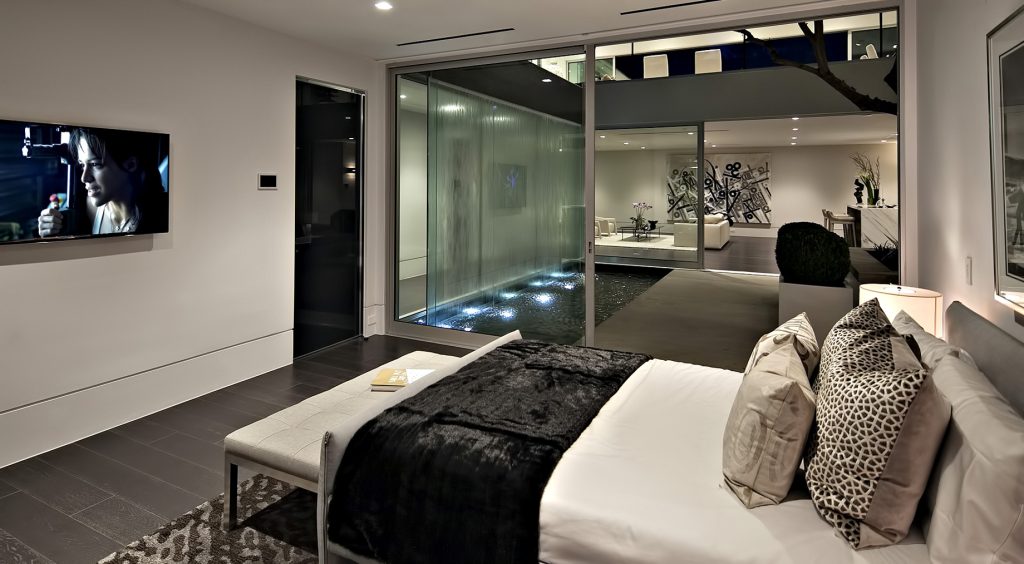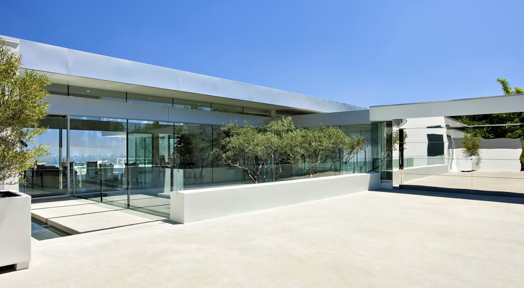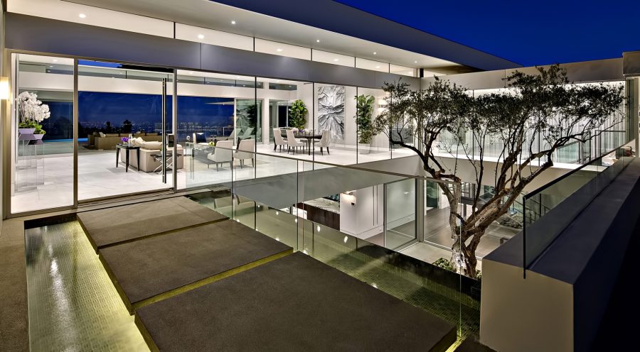 A dramatic two-story courtyard and water feature centered by an old growth olive tree seduces you as you enter the crisp modern interior that defines the concept of modern living. Large expanses of glass pull in sweeping vista views while disappearing walls of glass extend the living and entertaining area outside and over the zero-edge infinity pool to the city below. Delivering sweeping vistas from the Hills to the Pacific Ocean, with complete privacy behind large 12ft gates, this trophy estate is an impeccable example of a new standard of exceptional modern luxury.