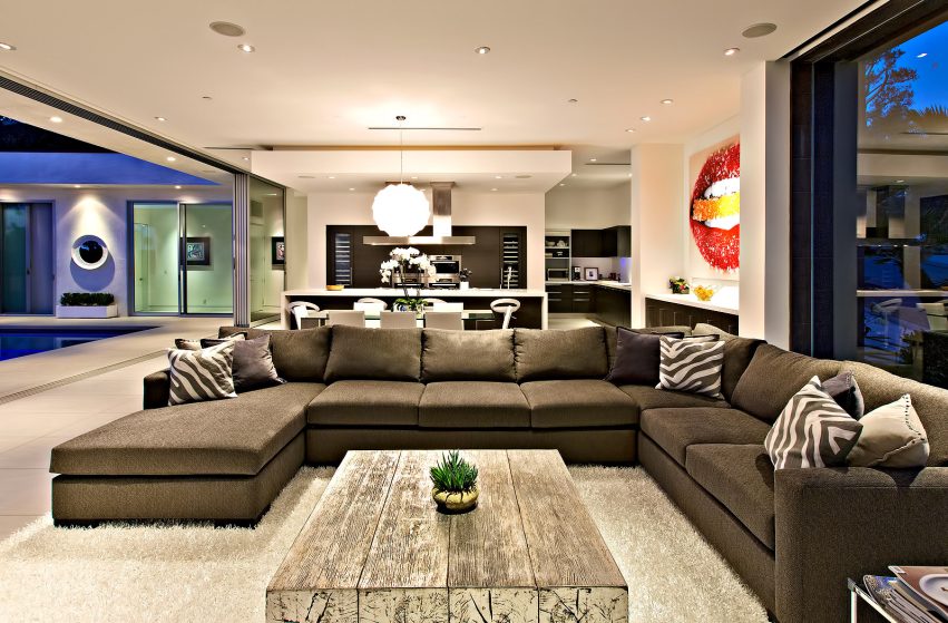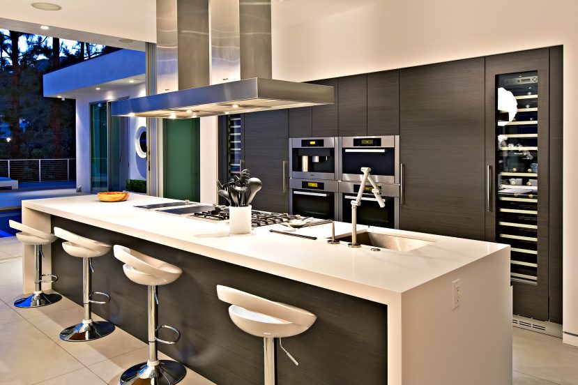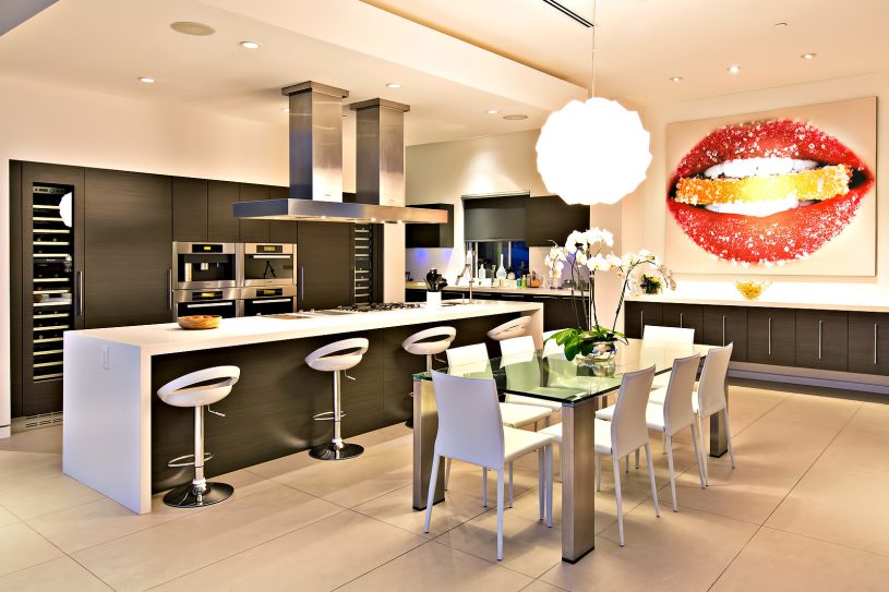 A fusion of luxurious elements and a generous open floor plan, this exceptional luxury home delivers clean lines and open spaces with walls of glass and Fleetwood doors that boast natural light filled public, formal and private areas. The stunning modern kitchen includes quartz countertops and professional Miele appliances with a wine refrigerator, built-in coffee maker, two dishwashers, and a built-in deep fryer and is complete with a long center island with breakfast bar.