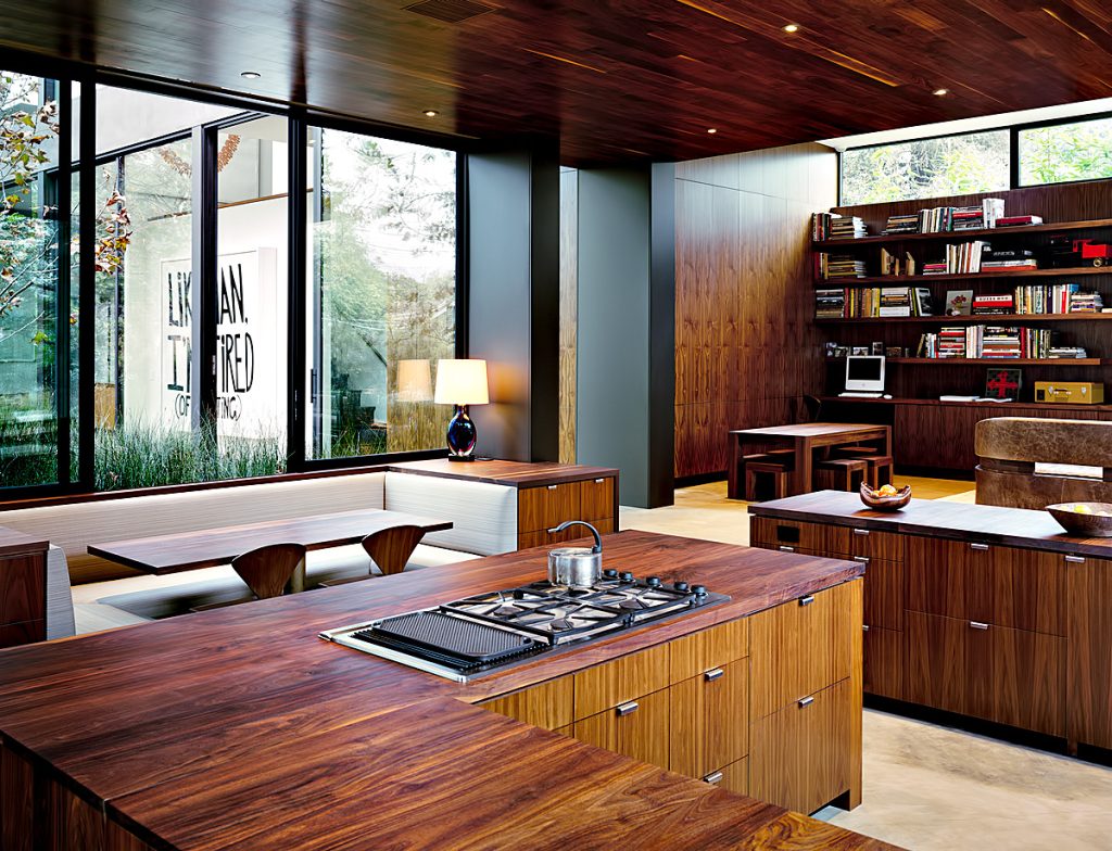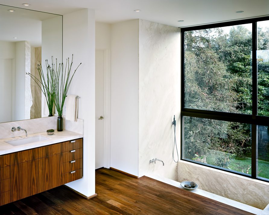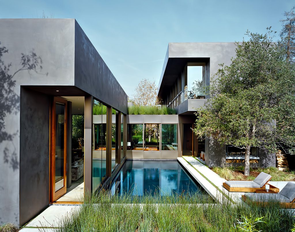 The extensive outdoor areas of the property include plants, buffalo grass, and oak trees providing a peaceful native California riparian landscape that provides a robust natural contrast to the main volumes of the residence.