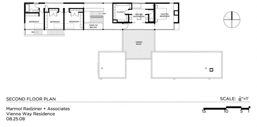 Floor-to-ceiling glazing throughout the home provides a visual and spatial link to the outdoor living areas and to the sunken pool from within the residence. The flow of the design allows convenient access between the one-story public space structure to the south and the two-story private space portion to the north.