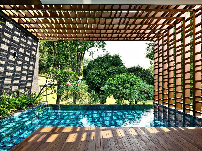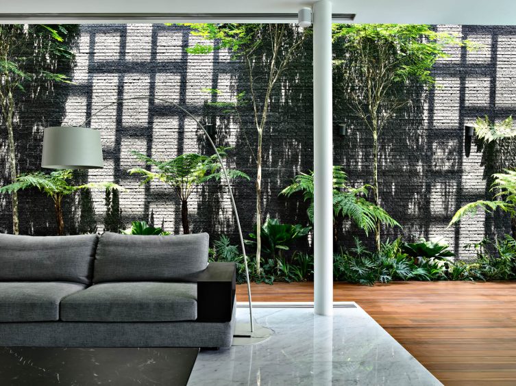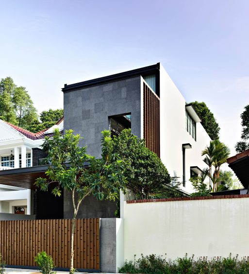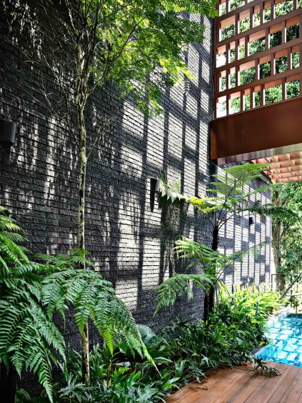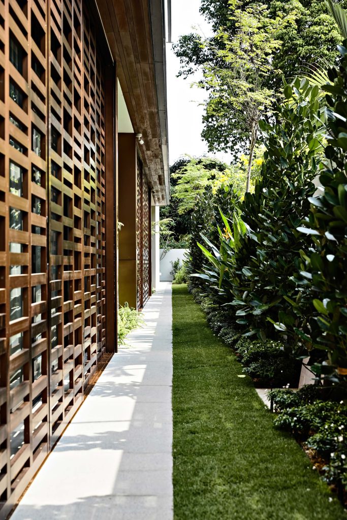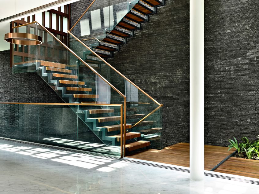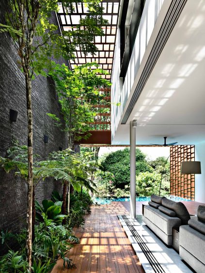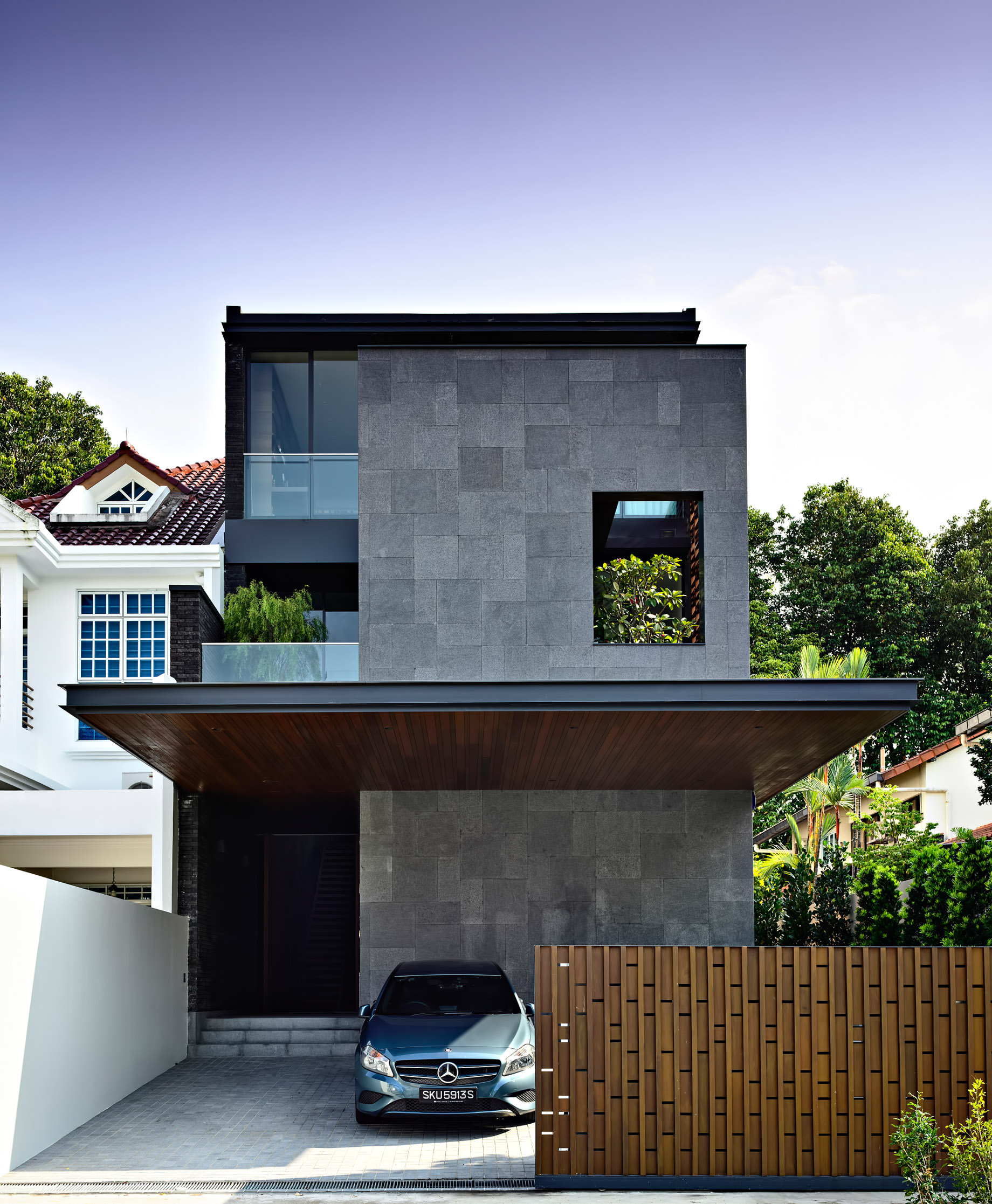 Nestled behind an unassuming face of granite and glass, this 2‐storey brick structure conceals a mesmerising view; offering a glimpse into the garden of Singapores former Command House. Situated on a long plot, the “Looking Glass” capitalises on its length to accentuate its view to the north. Upon entering, floating timber steps tease at the landscape ahead, framing the corridor of trees that blur the boundary between indoor and outdoor space.