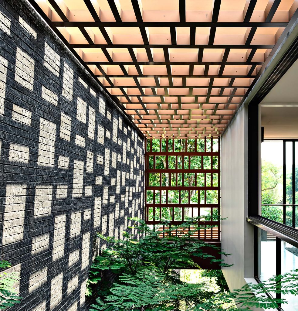 Bordered on one side by dark face brick, the foyer is abundant with light, owing to the double‐volume void that terminates at an intricate rectilinear screen and pergola. Stretching across the building, the pattern of vertical and horizontal lines provides privacy and sun shading whilst visually connecting each space to the scenery outside.