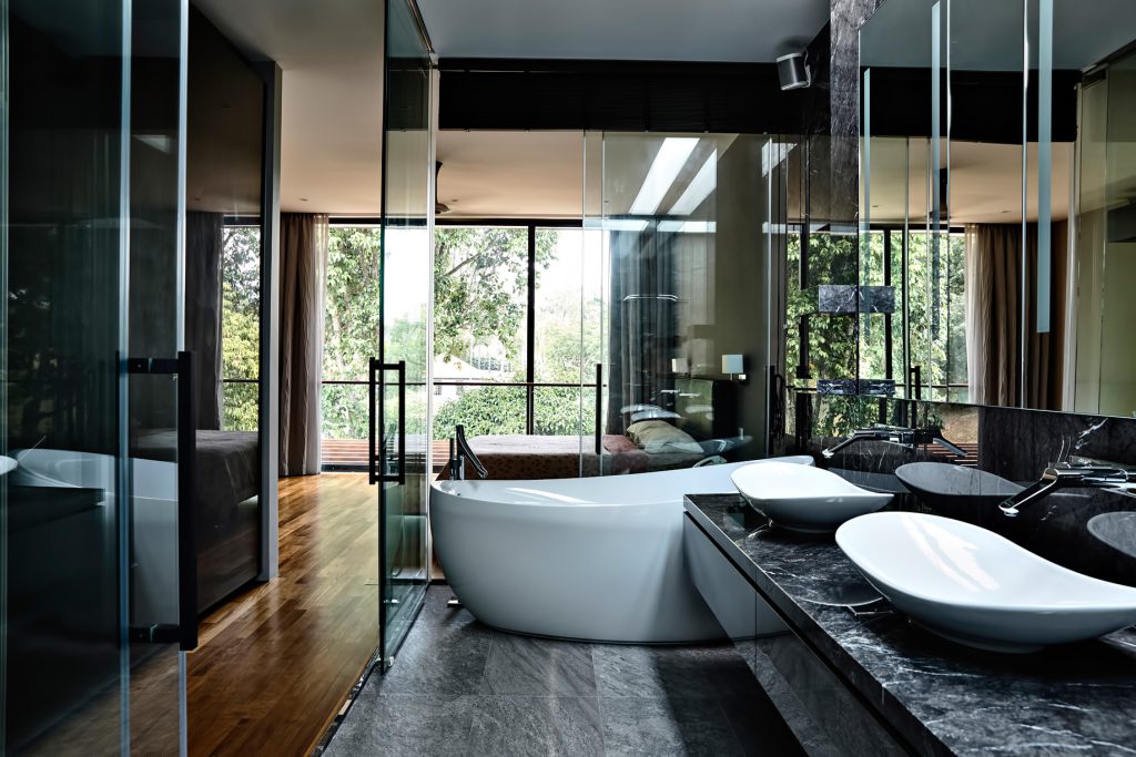Unconventionally, the full length living, and dining is situated on the second floor, allowing its open plan to free up the space and frame the landscape ahead. Finished with a modern interior, the contrast between luxurious marble, warm timber and textured brick evoke a timeless and modern atmosphere. Overlooking the stairwell, a glass study and three bedrooms occupy the top floor. As screen transitions from wall to roof, an interplay of shadows dance atop the infinity pool below, overlooking a glass‐less window of picturesque nature.