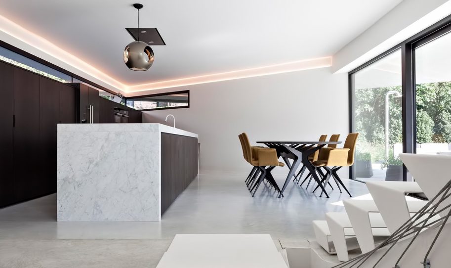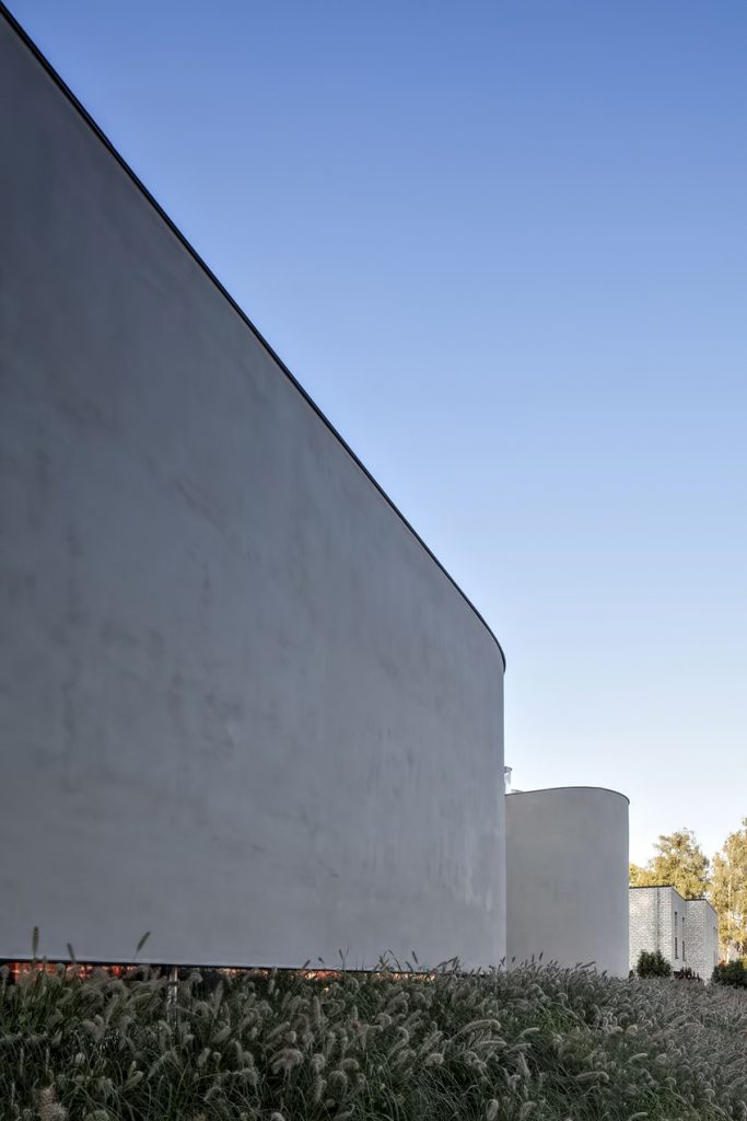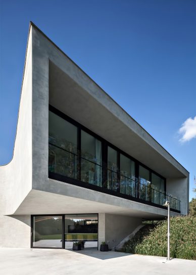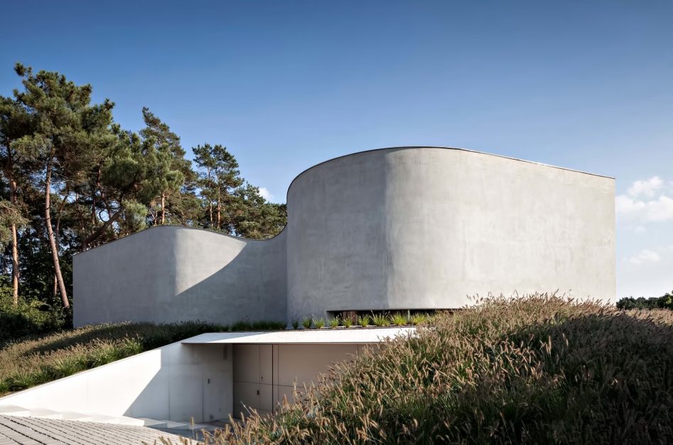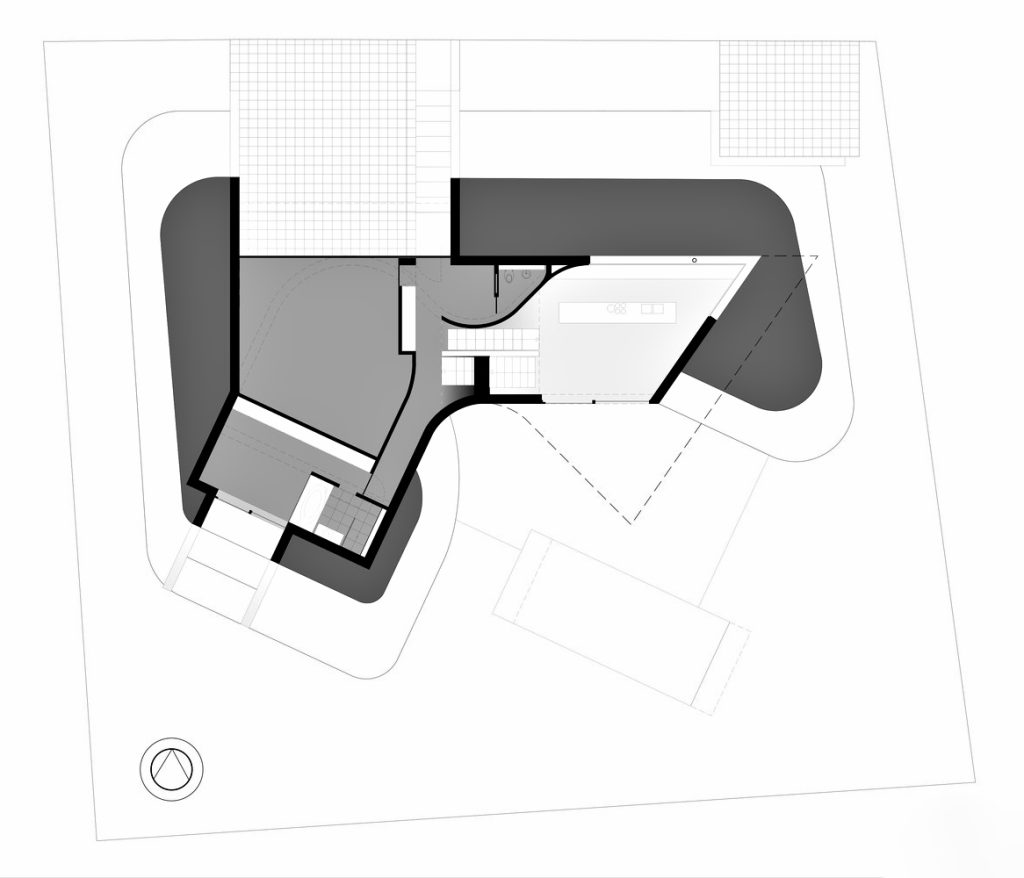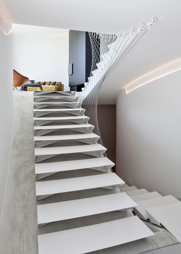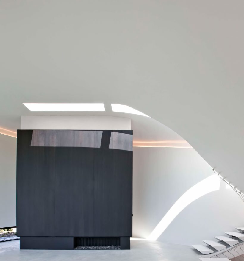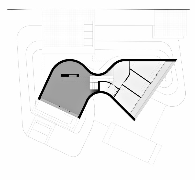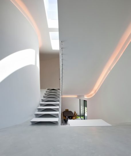 The flowing lines of the plan unfold across five split-levels. The entrance of the house, which is half a level lower than street level, is reached by way of a slope within a concrete framework in an artificial landscape. Although the programs blend into each other, natural light provides a unique atmosphere at every level: the continuous dispersion of light on the curved walls offer a perfectly orchestrated ambiance of impactful simplicity. A sloping balustrade staircase across multiple levels that consists of parabolic cables intensifies the interweaving of the different spaces.