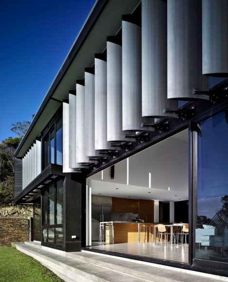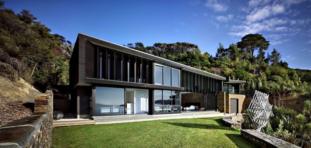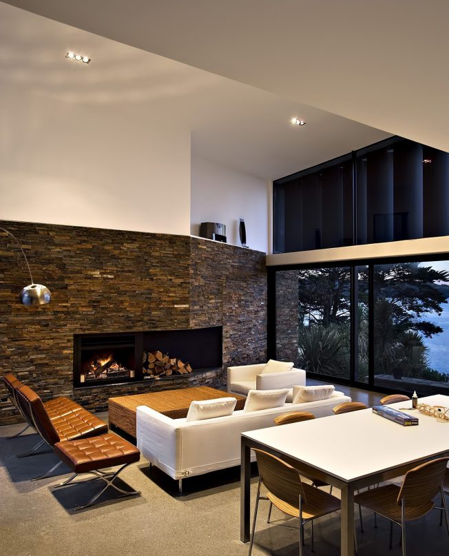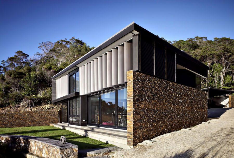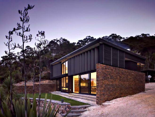 The materials and form of the residence were chosen to be empathetic to the natural setting and fauna. The house is designed to integrate into the landscape with stonewalls that were sourced locally and tinted windows to limit reflection and the timber upper level stained dark to blend into the bush behind because it has been said that the colour of the New Zealand native bush is black.