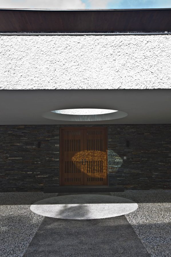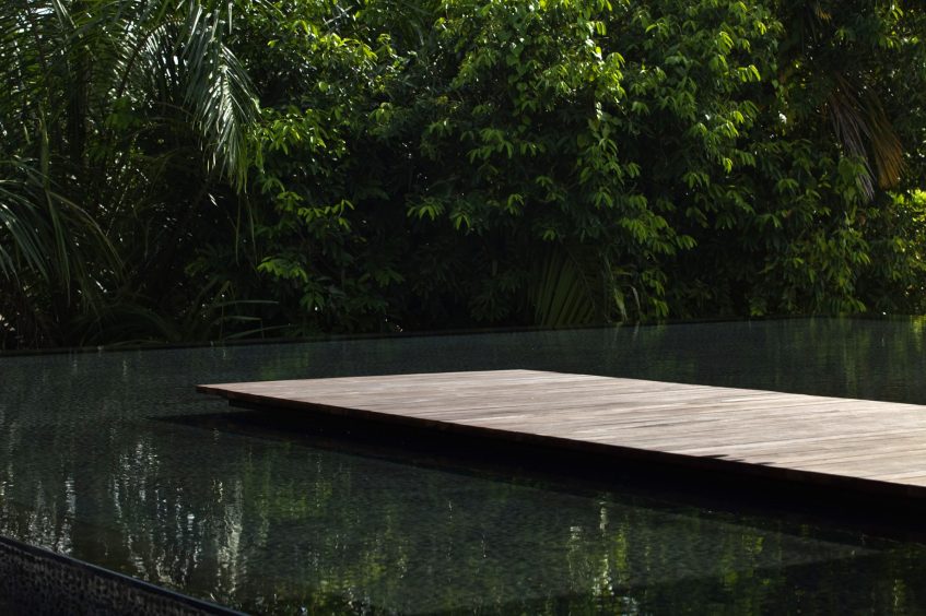 The sensational Water Cooled House is hidden away from the road on a site is surrounded by a verdant screen of mature trees providing privacy from adjacent properties. Breezes blowing transversely across the site bring another notable aspect of the location. This is a contemporary home that prioritized environmental coolness as a consistent attribute with the serene tranquility of luscious tropical surroundings. As a gesture to the prominent role that water plays within the residence, an oculus within the pond highlights the main entrance, the circle of sunlight cooled and animated by the constantly changing sinusoidal patterns of refracted rays through the water above.