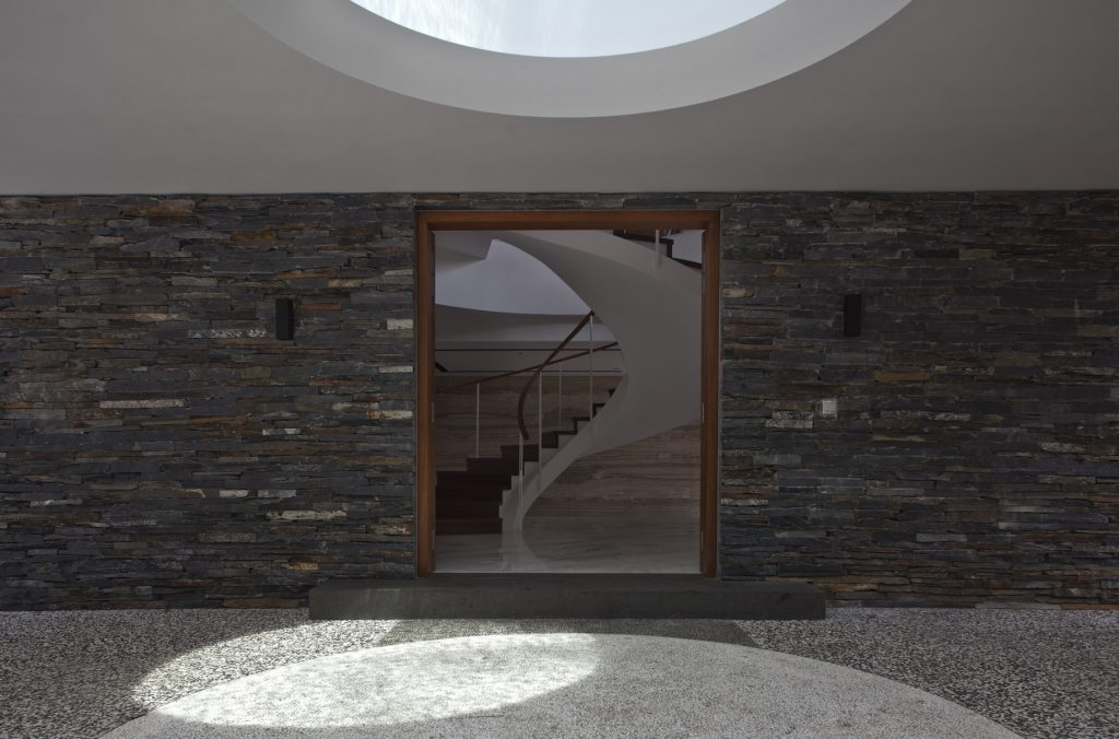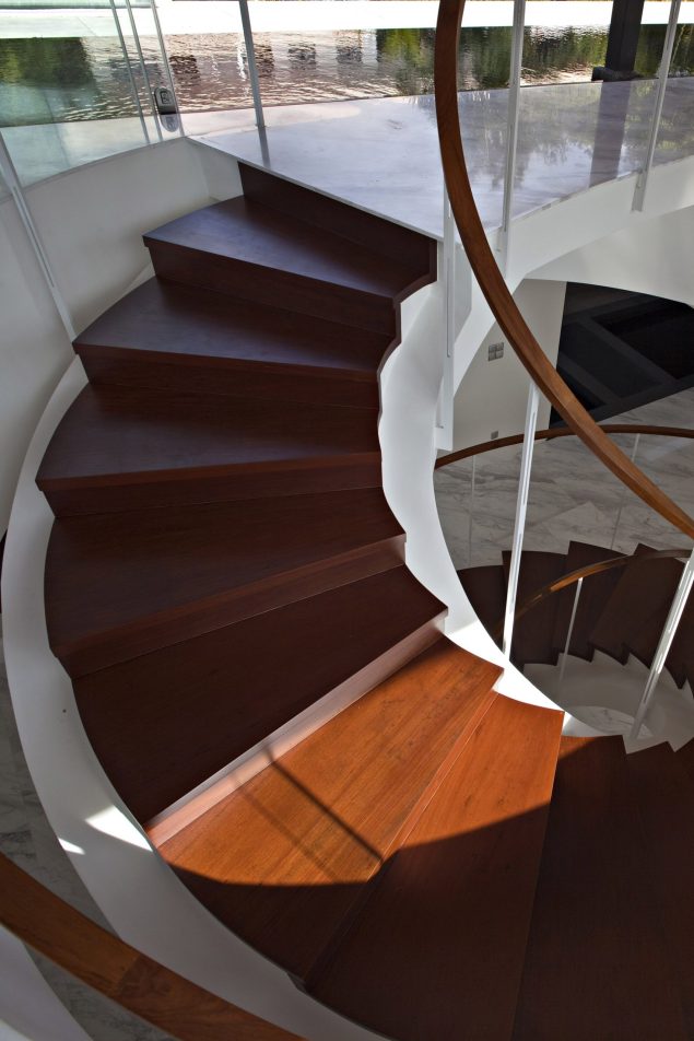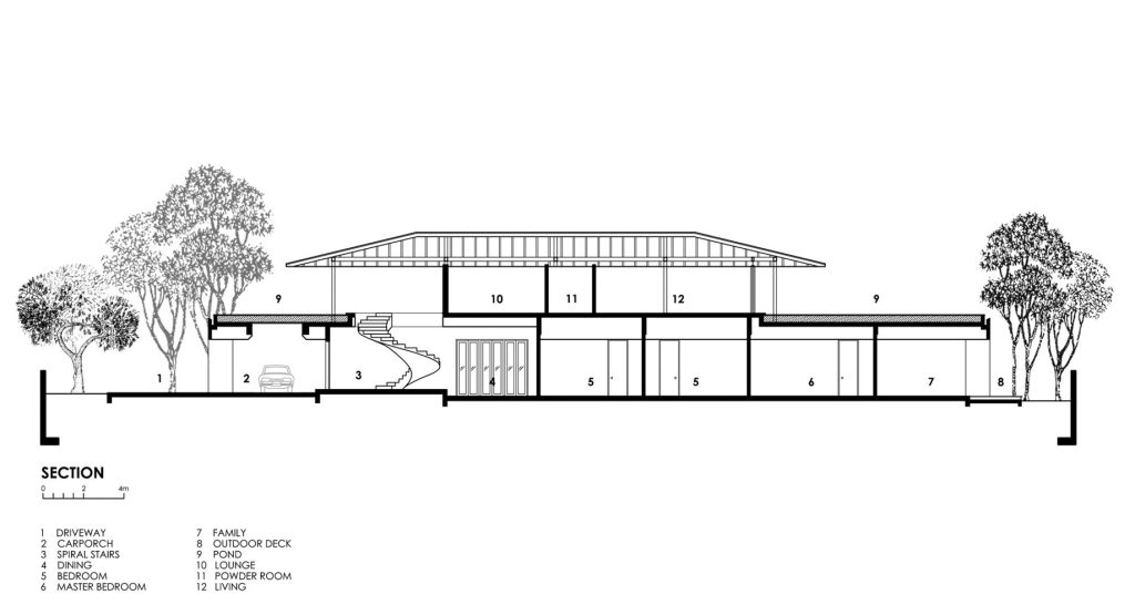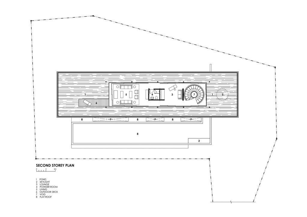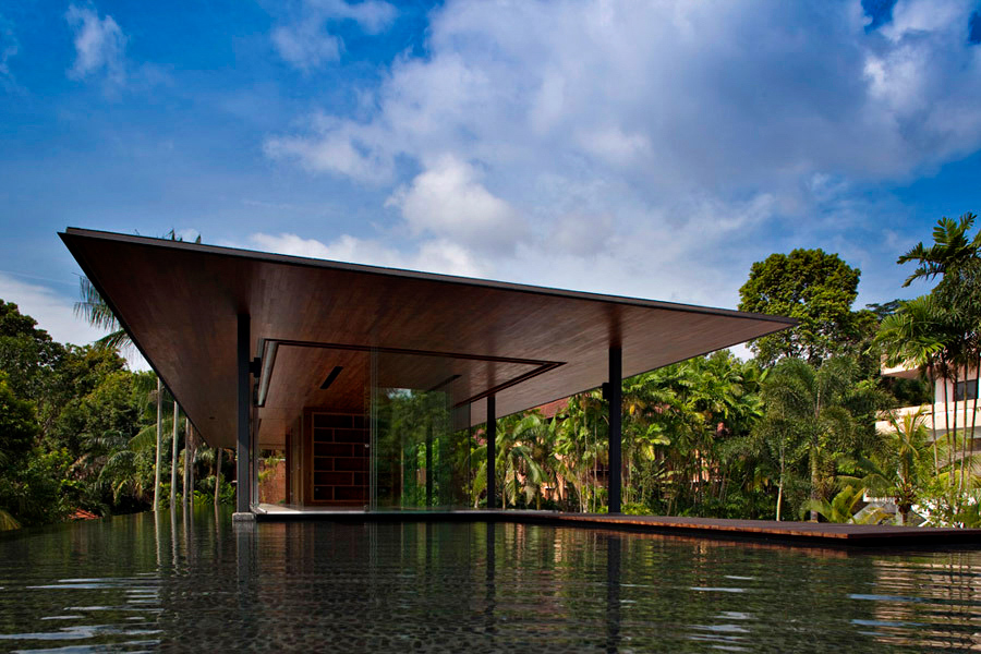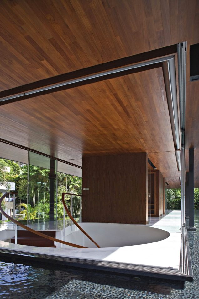 The concept developed for the home inverted planning and hierarchical norms common in local residential planning. To fully appreciate the mature and variegated natural environment and stretch the potential for visual depth and distance, the main living room and study were located in a pavilion on the second storey. It was designed with minimal enclosing and supporting structure so as to maximize the elevated vistas. To unconsciously guide visitors to the living pavilion above, a minimal spiral staircase touches down within the entrance foyer. Hints of the tree-lined views are seen through the large circular void connecting the entrance foyer to the pavilion above. A dark reflecting pond surrounds the pavilion which assists in refining the experience of serene isolation and privacy and frames. The occasional bird dipping into the pond, rippling the surface further ties the house to the natural surroundings. The purpose of the second storey pond is also designed to thermally insulate the dining, bedrooms and family spaces underneath from solar heat gain. In the same way, the water body above also helps to regulate temperature swings within the house.