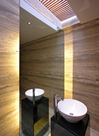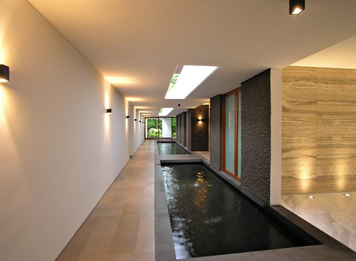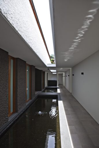 On the first storey, the residential and service functions of the house are delineated by a long continuous light and air well that is paralleled below by a similarly long and continuous koi pond. The pathway running along-side the pond that leads to the bedrooms hides the substantial service areas which are beyond the pathway wall. As with the second storey pond, the air well and first storey koi pond is also designed to facilitate in micro-cooling the first storey rooms and spaces. The pathway is a conduit for prevailing breezes; the koi pondโs thirty metre length and two metre width expose a sixty square metre surface area within the house to those breezes for evaporative cooling.