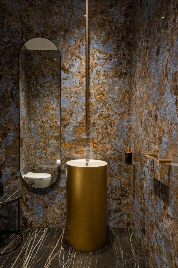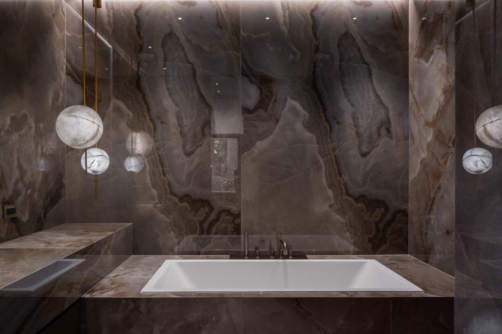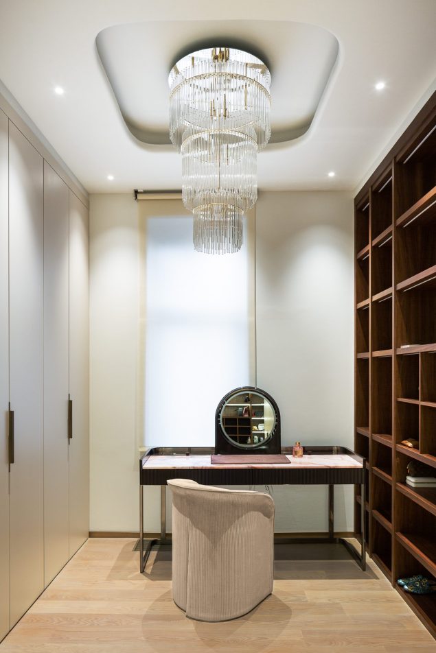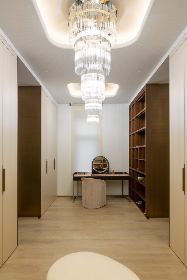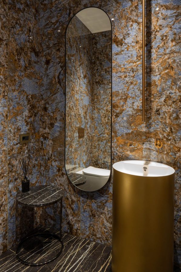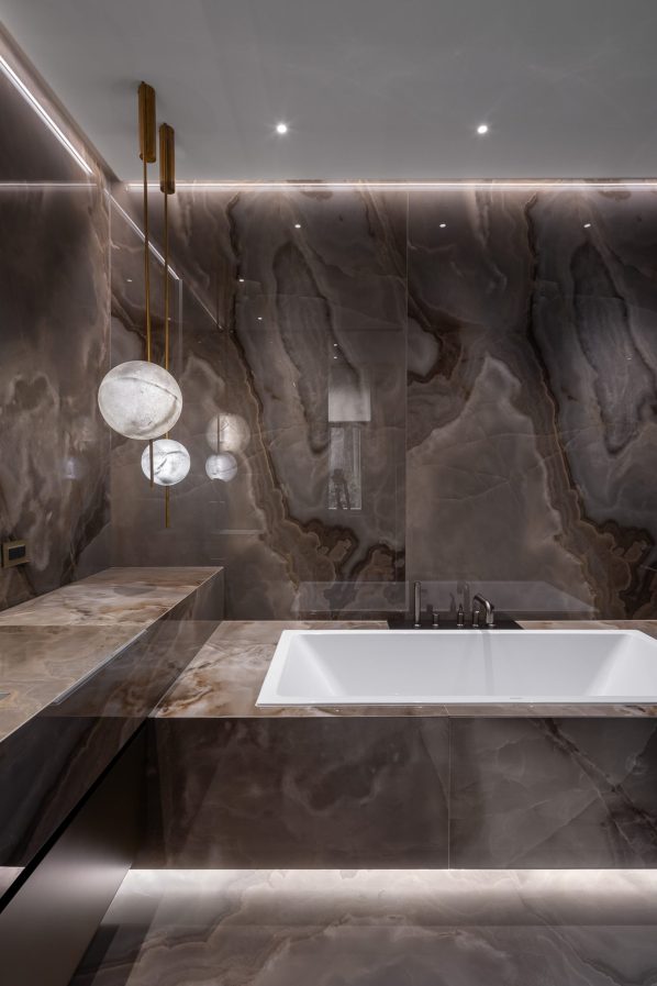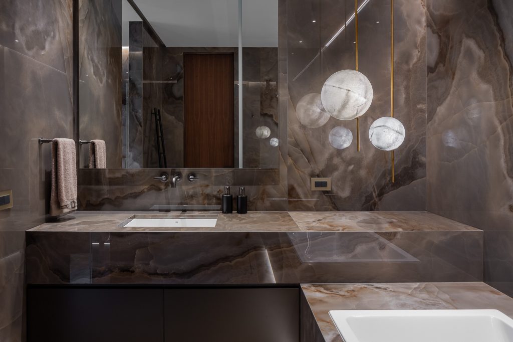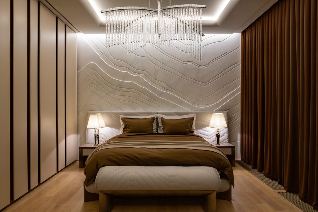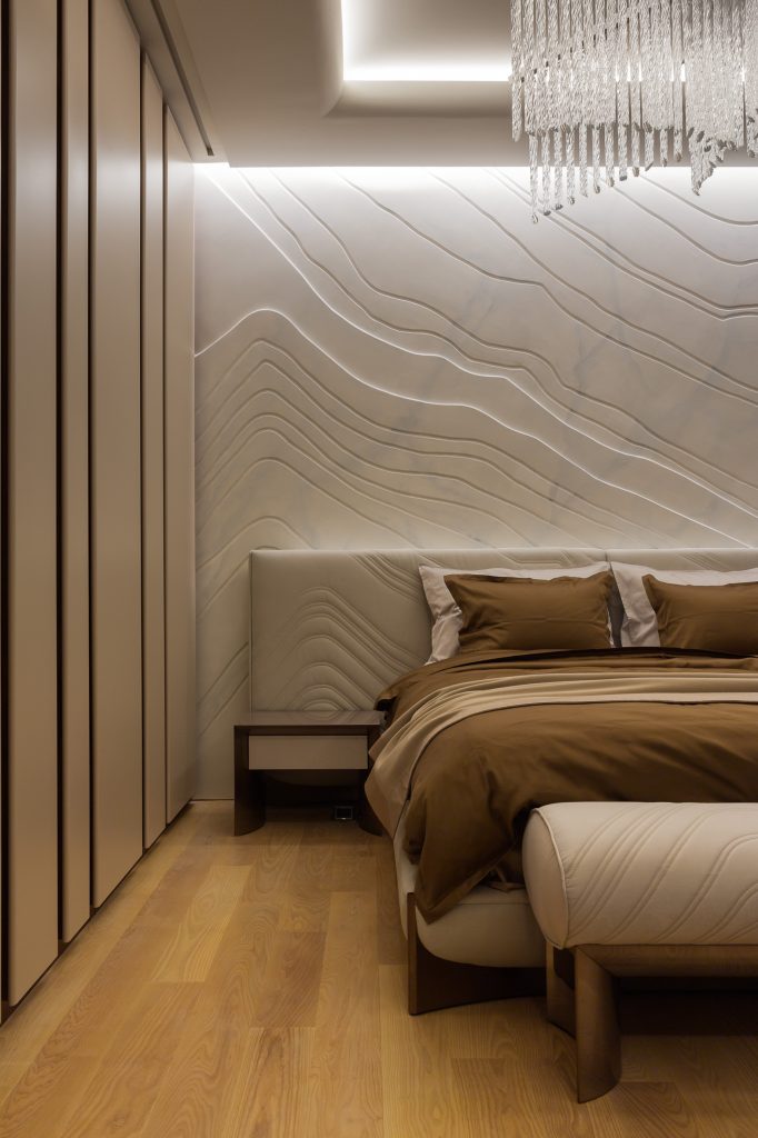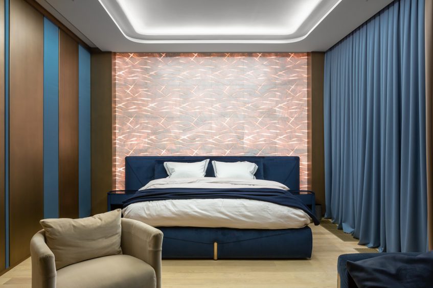 In both spaces the walls with the headboards are highlighted as accents. If in โTurquoiseโ bedroom it is made of natural Lithos marble with backlighting, then in โBrownโ the wall accentuates with a smooth relief pattern imitating marble made of plaster. The furniture in both bedrooms was chosen to match the main color of the interior. Volumetric chandeliers and local lighting are managing the lighting of the bedrooms. It is important that all combinations turned to be very light, and the spaces of the bedrooms got a lot of air.