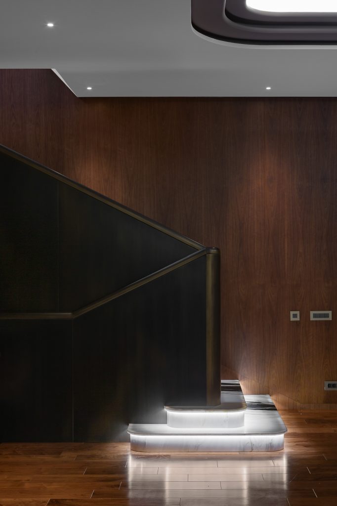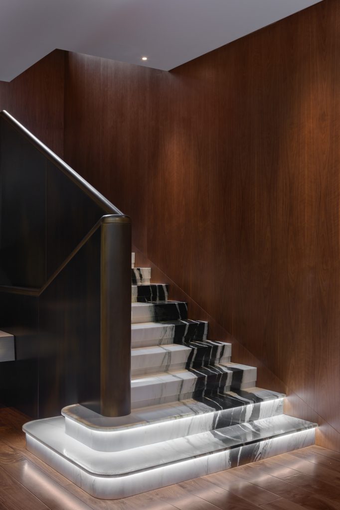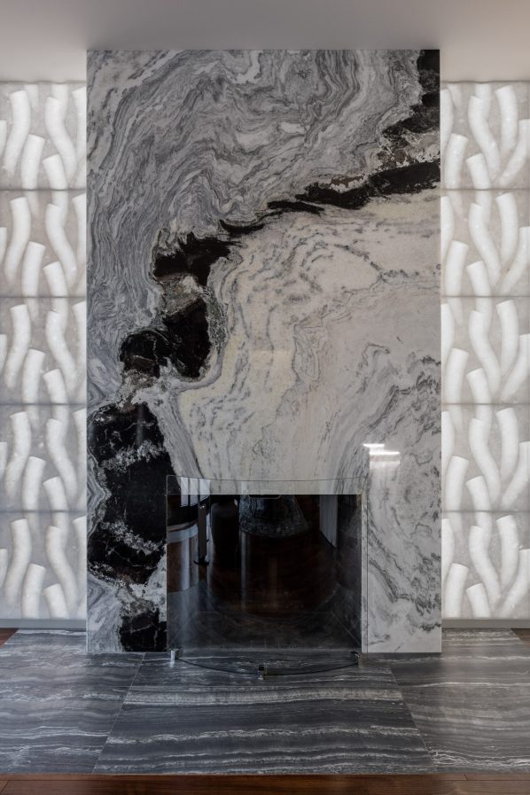 On the first floor, a dark calm tone serves as a contrasting backdrop for the fireplace and the marble staircase, made of black and white Dalmatian marble. The fireplace portal is decorated with Lithos Design light stone panels with 3D effect. There is a stone staircase made of the same marble with a characteristic pattern of stone opposite the fireplace.