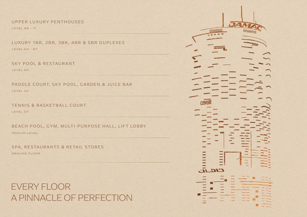 Experience the pinnacle of Dubai luxury at Cavalli Tower. This limited collection of penthouses redefines opulent living with breathtaking Palm views, private pools, and exquisite finishes. Live limitless in a 70-story icon where the world is at your doorstep. Overlooking the Palm Jumeirah, these ultra-luxury 3-4 bedroom penthouses, offer a truly singular and exclusive lifestyle. Enjoy a 900-square-meter beach pool, a sky garden on level 58 with signature dining, and a dedicated wellness area with state-of-the-art gym and spa. The penthouses boast double-height ceilings, lavish use of marble, metal, and crystal, and a main terrace with a private swimming pool, seamlessly blending natural elements. Located in the prestigious Al Sufouh neighborhood, Cavalli Tower puts you at the heart of Dubai’s vibrant business and leisure destinations.