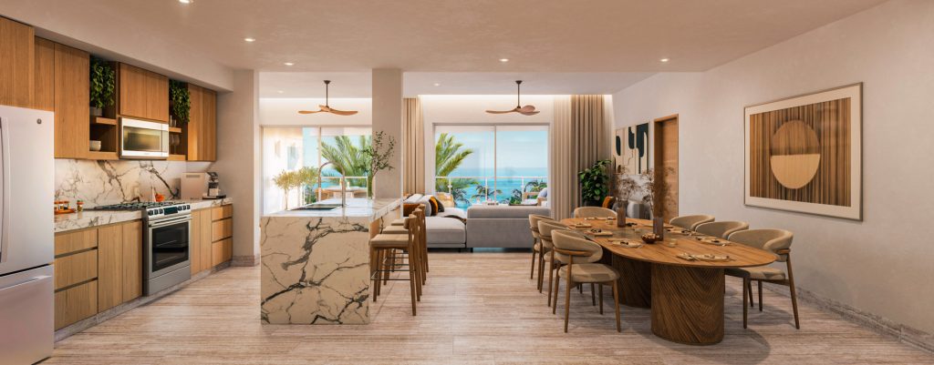 Every design decision at Tortuga Bay was made to celebrate its setting. The architecture draws inspiration from Baja’s natural landscape with soft sand hues, organic textures, and rhythmic horizontality that mirrors the calm expanse of the sea. Floor-to-ceiling glass panels dissolve boundaries between interior and exterior, allowing residents to feel connected to the ocean from sunrise to sunset.