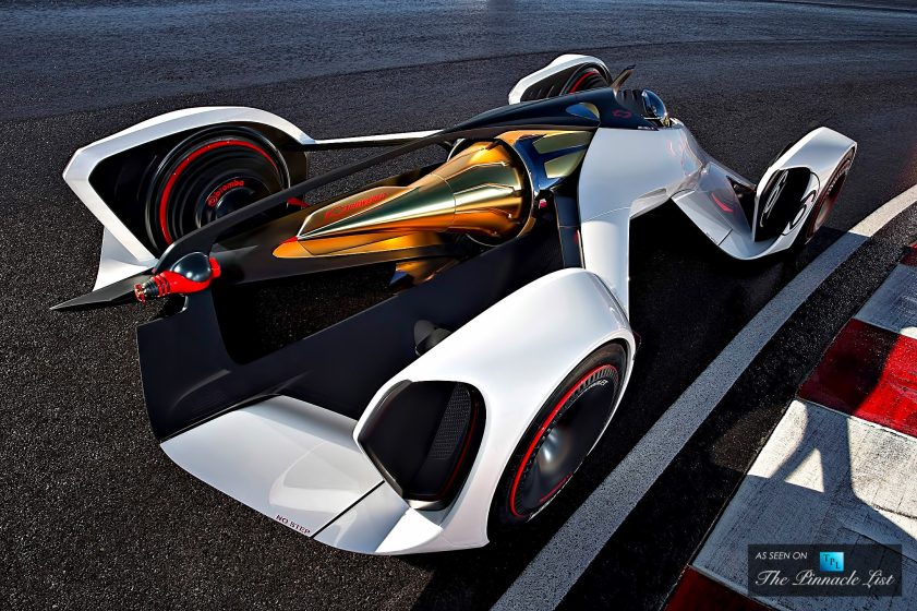 The driver of this futuristic vehicle lays in an unconventional Tron-like prone position – face down with the driver’s arms and legs spread towards the front and rear wheels. This highly active configuration, enabled engineering to build the race car’s propulsion and suspension systems around the driver, allowing for progressive strategies like active and driver-adjustable aerodynamics.