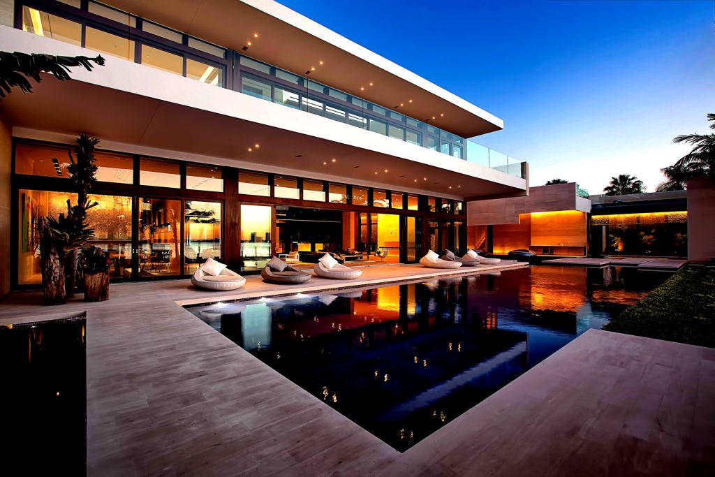 Boasting its own private beach with pink sand imported from the Bahamas, the view across the infinity edge pool facing the ocean creates a shimmering spectacle of transitioning light as twilight descends and the cleaning breezes of night approach. Delivering orchestrated compositions of vivid light and shadows at the boundary between night and day, the estate becomes a visual canvas revering the cascading sky and water.